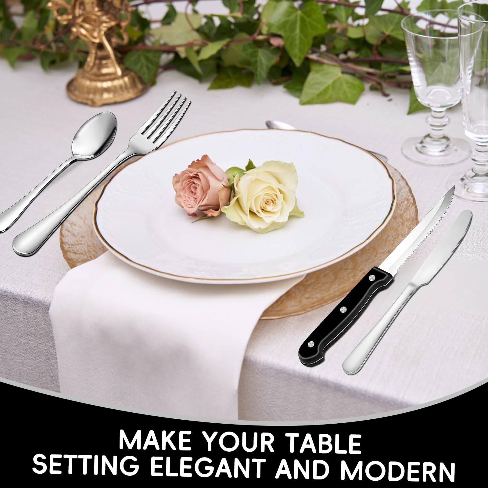 - COST-EFFECTIVE SET: Each piece of the spoons and forks set ergonomic handle has a proper thickness without sharp edges. And steak knives's edges are sharp enough to slice cleanly through all the meat. Ideal for catering, picnics, weddings, BBQ, holiday dinners, party serving, family reunions and everyday use. This tableware drawer set is a wonderful present for Easter, housewarming, thanksgiving, christmas, birthday and more.