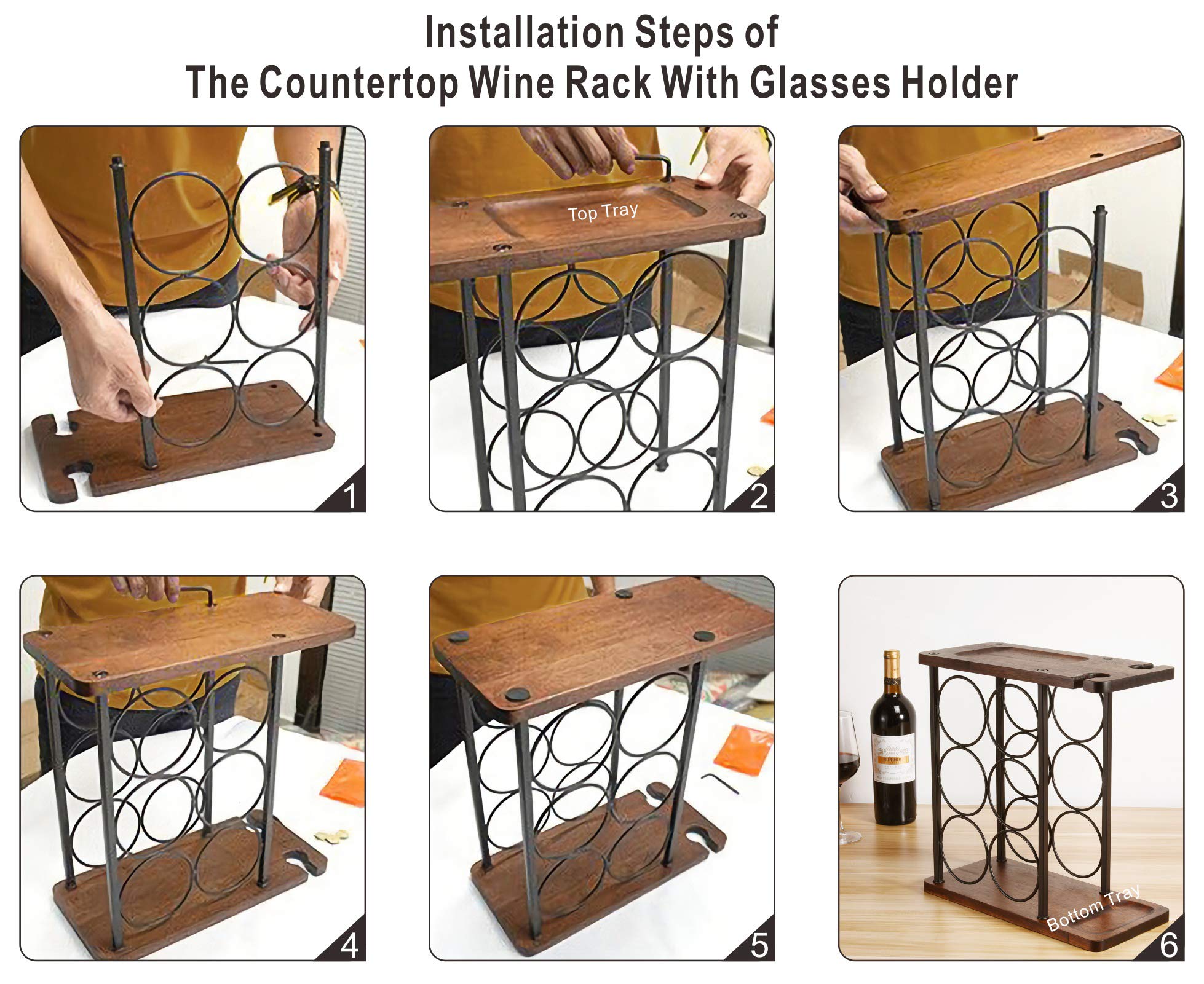 - š·ćBest QualityćSimple and creative European and American style wine bottle holder and red wine glass holder. The frame is made of steel, black powder-coated process, oxidation resistant and rust-resistant. The thick wooden base at the top and bottom, the whole wine rack is stable and beautiful.