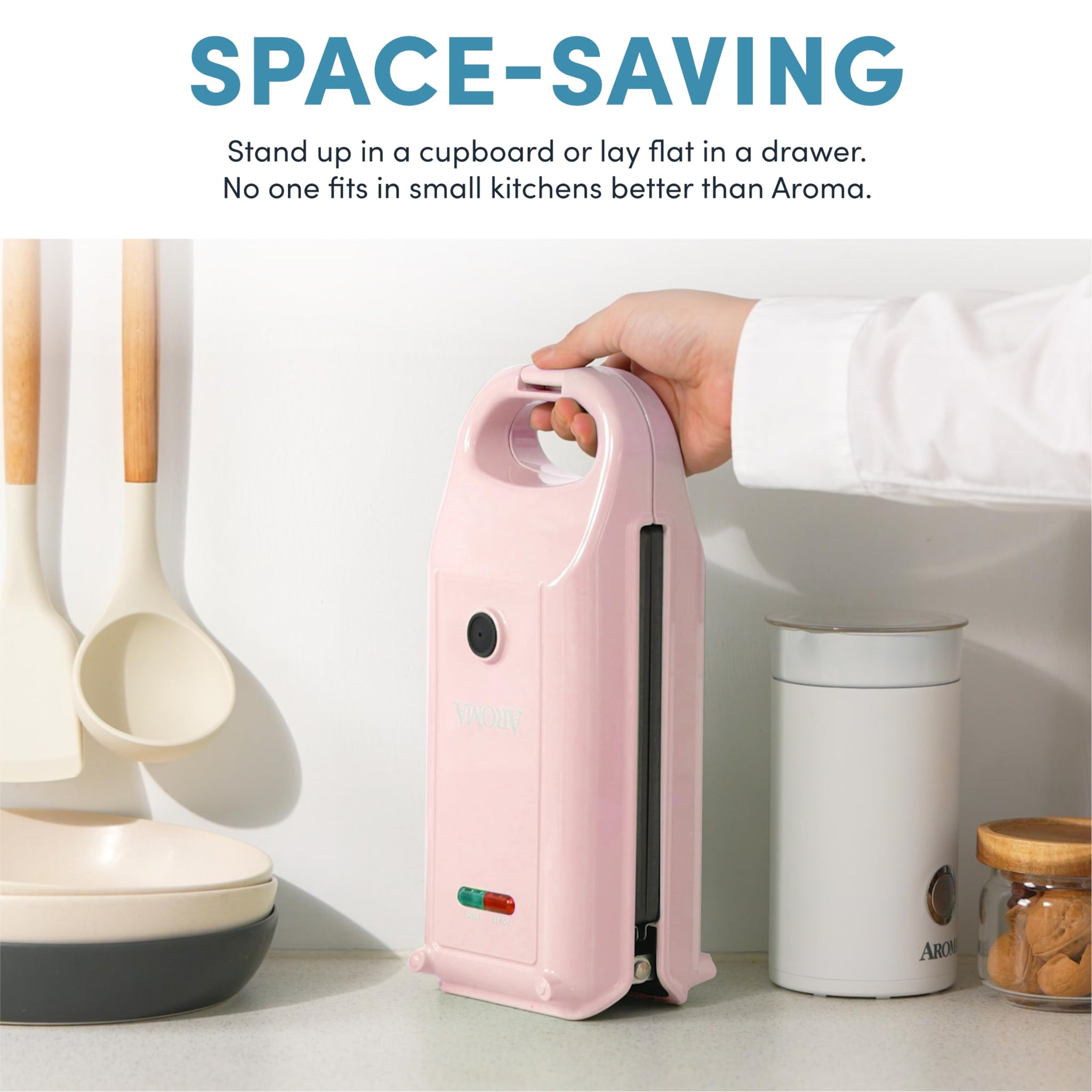 - ULTRA-SLIM: Aroma’s flip waffle maker is small enough to lay flat in a kitchen drawer, and it stands upright to fit in crowded cupboards. Perfect for RVs and dorms!