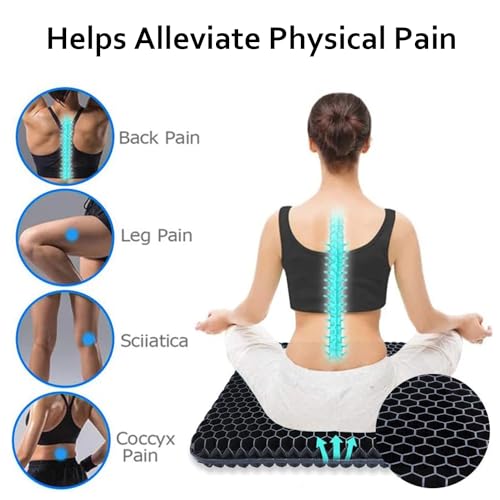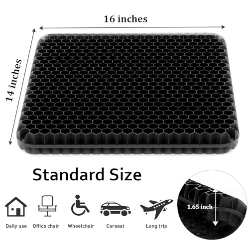 • 【Honeycomb Design】It adopts more than 500 balanced pressure and flexible honeycomb grids, disperses the pressure of the whole buttocks and thighs, perfectly fits the buttocks curve, soft and without losing support force. Medical grade gel material doesn't irritate the skin, the thickness of 1.65inch is enough to support the weight of the body.