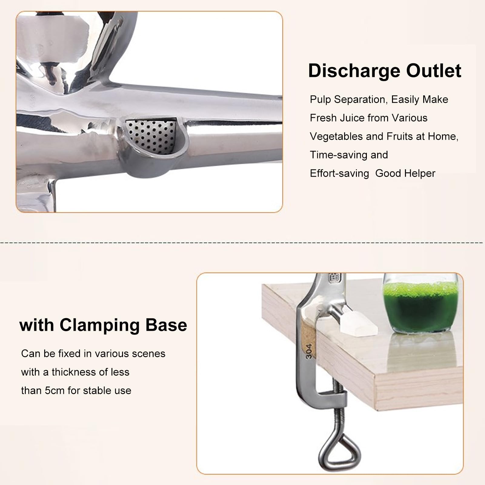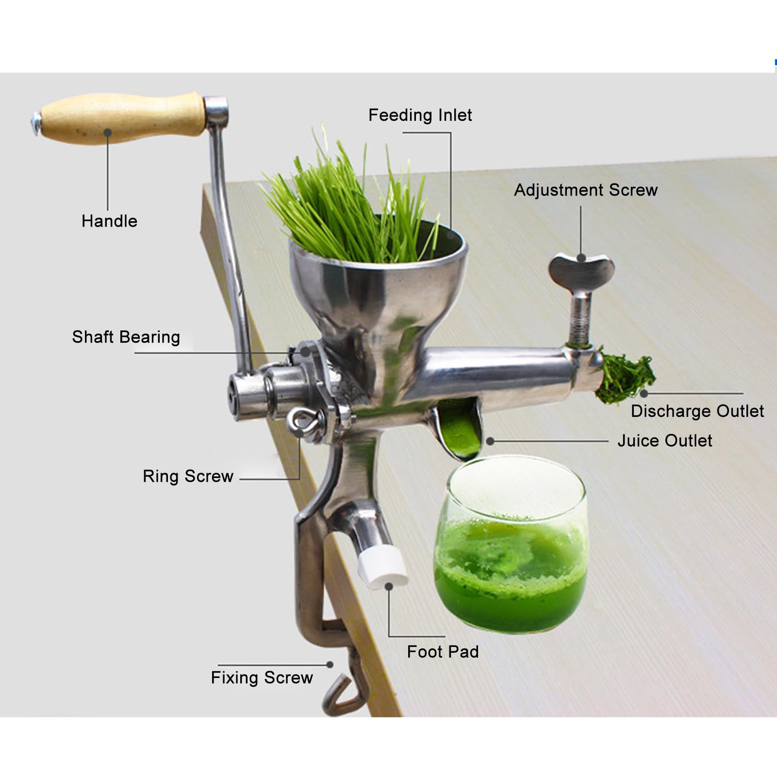 Details: Description:Our Stainless Steel Manual Wheatgrass Juicer is a perfect blend of durability, efficiency, and cleanliness. Weighing approximately 2446.00g, this robust juicer maintains a healthy lifestyle by retaining the nutrients during the juice extraction process. Its secure clamp base provides a snug fit to any tabletop with a thickness less than 5cm, ensuring stability during the juicing process. Suitable for squeezing the juices of wheatgrass, oranges, ginger, pomegranate, watermelon, and even more, this device is your ideal kitchen companion for a fresh start every day!Specification:Item Type: Stainless Steel Manual Wheatgrass JuicerMaterial: Stainless Steel, WoodWeight: Approx. 2446.00g / 86.28ozSuitable: for Tabletops with a Thickness of Less Than 5cmSuitable: for juicing Wheatgrass, Orange, Ginger, Pomegranate, Watermelon, and morepacking list:1 x Juicer Main Unit1 x Handle1 x Cup1 x Brush1 x Plunger1 x Filter1 x Axis Sleeve2 x Foot Pad
