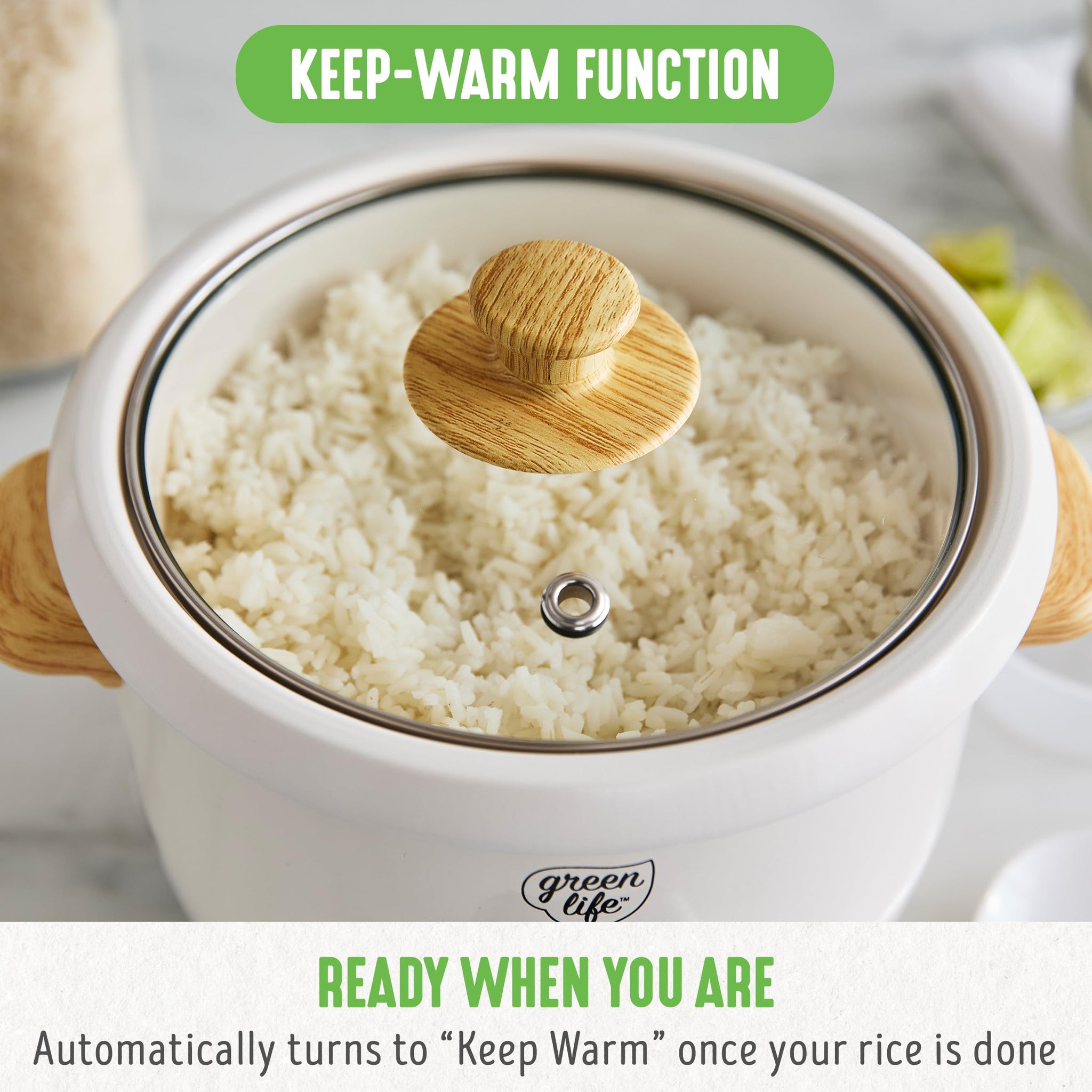 Details: Designed to make up to 6 cups of rice with just one touch, this convenient companion turns ordinary rice into fluffy, flavorful masterpieces. Featuring our PFAS-free ceramic nonstick coating, this rice cooker makes meals healthier and cleanup even easier. Thanks to the simple one-switch design, you can flip to white or brown rice and let the rice cooker do all the work. The unit automatically switches to Keep Warm after cooking is complete for perfect rice when you want it. Plus, the stay-cool, wood-print handles allow you to transport with ease.