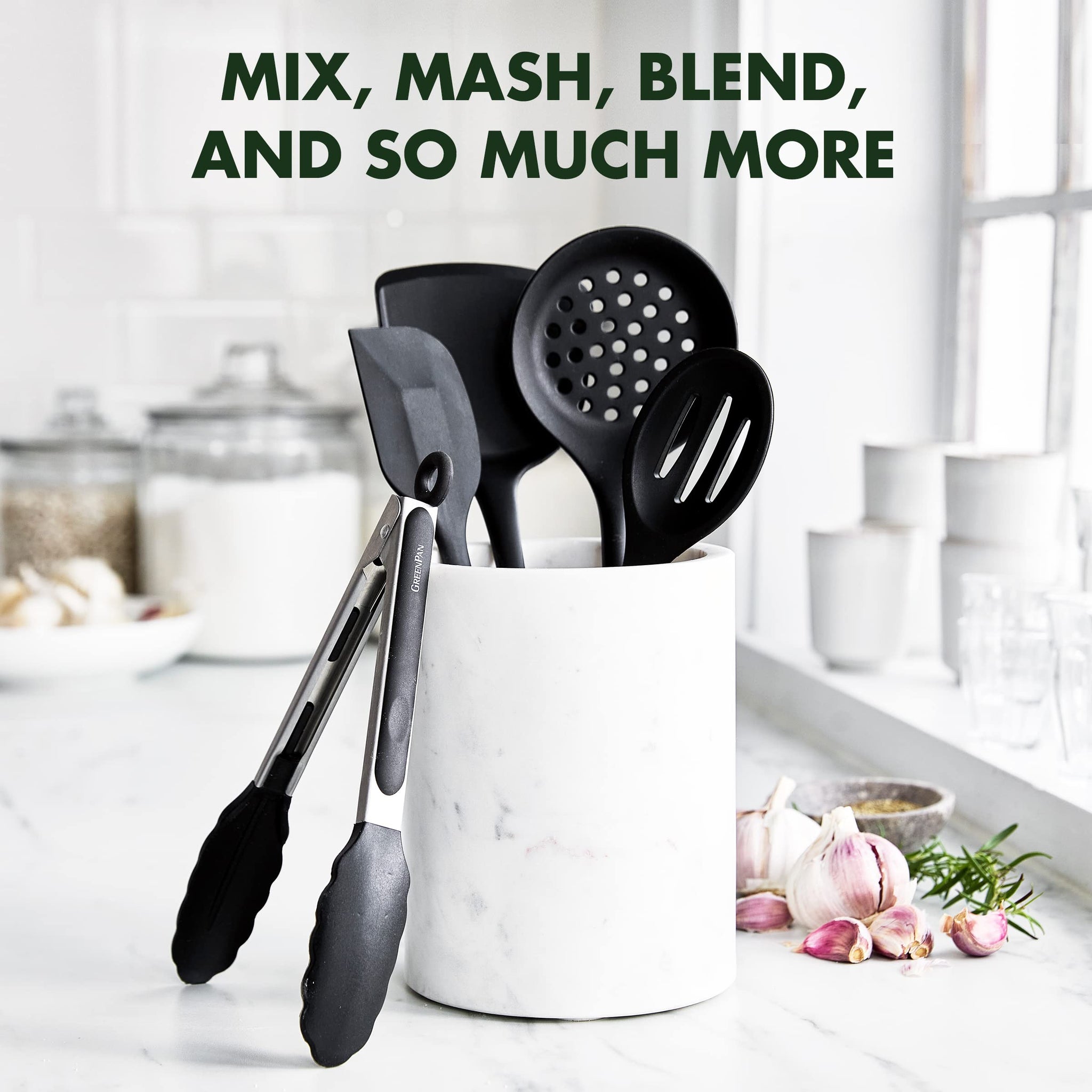 Details: Take on a wide range of kitchen tasks with this ultra-versatile set from GreenPan. Crafted from silicone, these tools take on your daily tasks with ease. Mix, serve, stir, flip, mash, blend, scramble, and so much more! And don’t worry about your ceramic nonstick pots and pans. These utensils are designed for maximum scratch-free performance on ceramic nonstick surfaces. Each piece is dishwasher safe to make cleanup simple. This versatile kitchen utensil set includes: tongs, turner, spatula, skimmer, and slotted spoon.