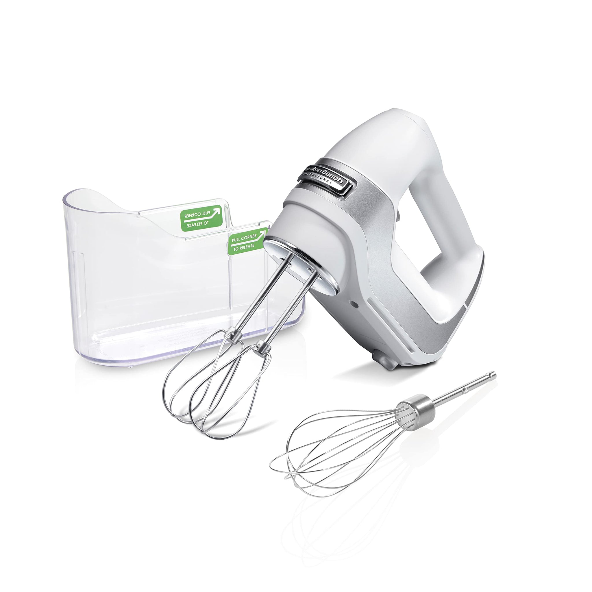 - Includes snap-on Storage Case with Beaters & Whisk. Keep everything in one place. Includes stainless steel beaters and a whisk that are dishwasher-safe.