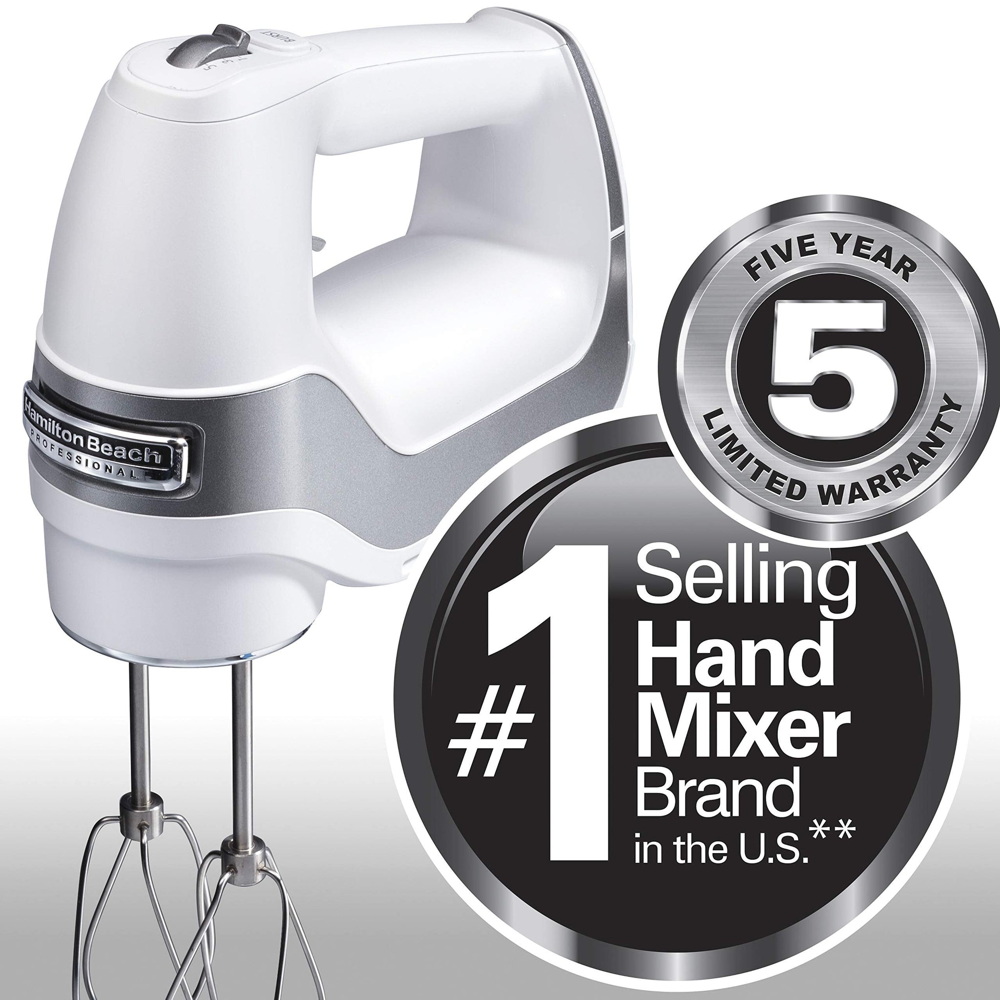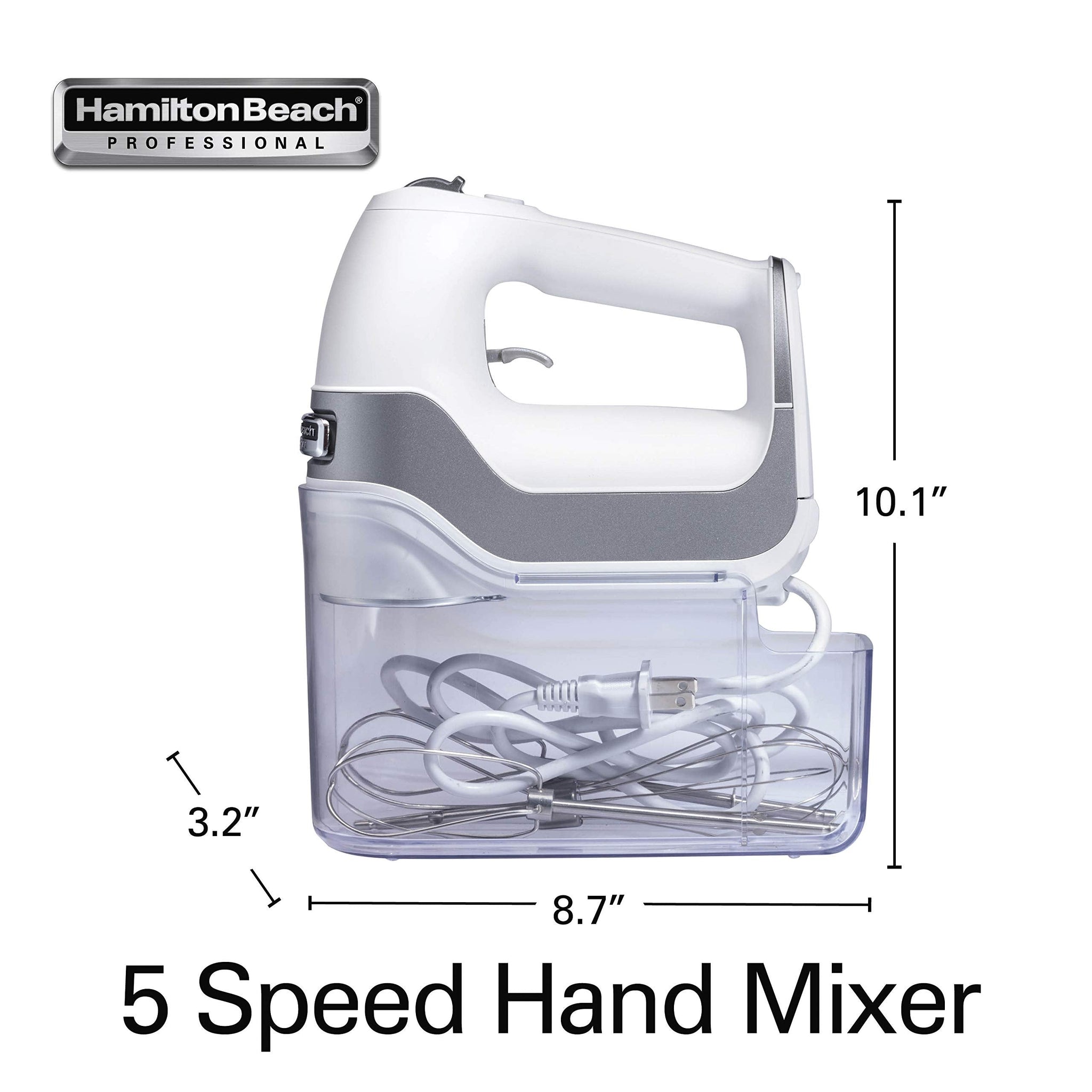 Details: Mix Any recipe effortlessly with the Hamilton Beach professional 5-Speed Hand mixer. This electric mixer has a slow start that prevents splatters, a quick burst at every level and a Snap-On storage case to make baking easier.