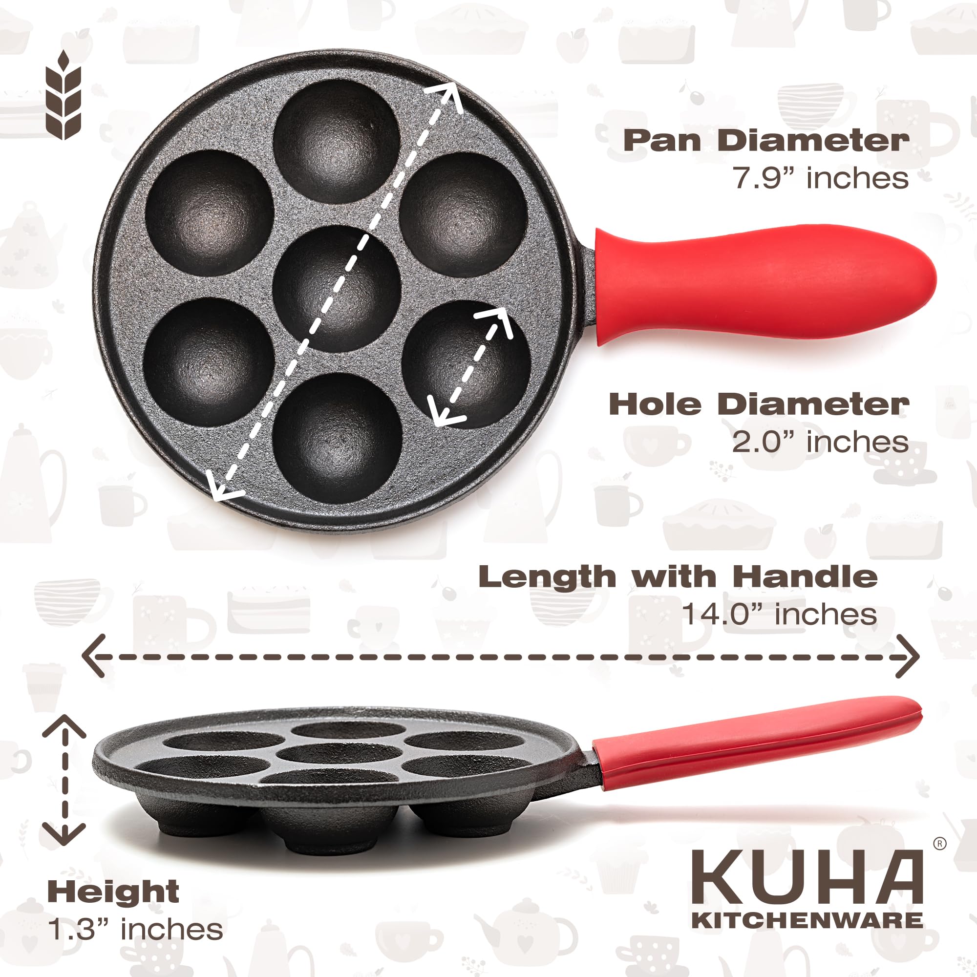 - Optimal Design for Perfect Cooking; Our cast iron cookware non stick pans feature a 7.9" diameter and a 2" hole diameter; this ebelskiver pan is designed for even heat distribution; preheat and oil your pan to enhance the non-stick seasoning over time