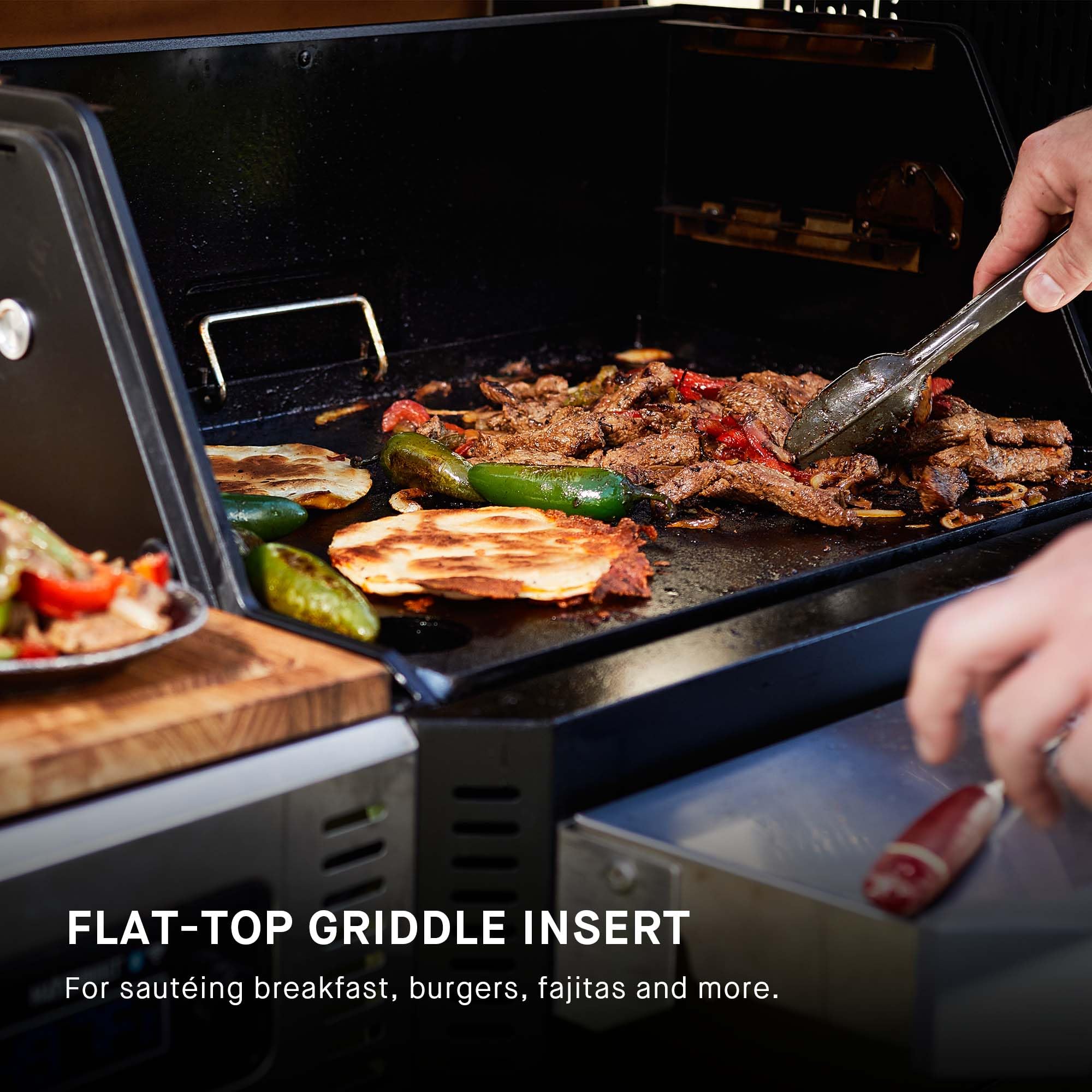 - Includes a flat top griddle insert and cast iron grill grates with 800 total square inches of cooking area (including the two porcelain-coated smoking racks)