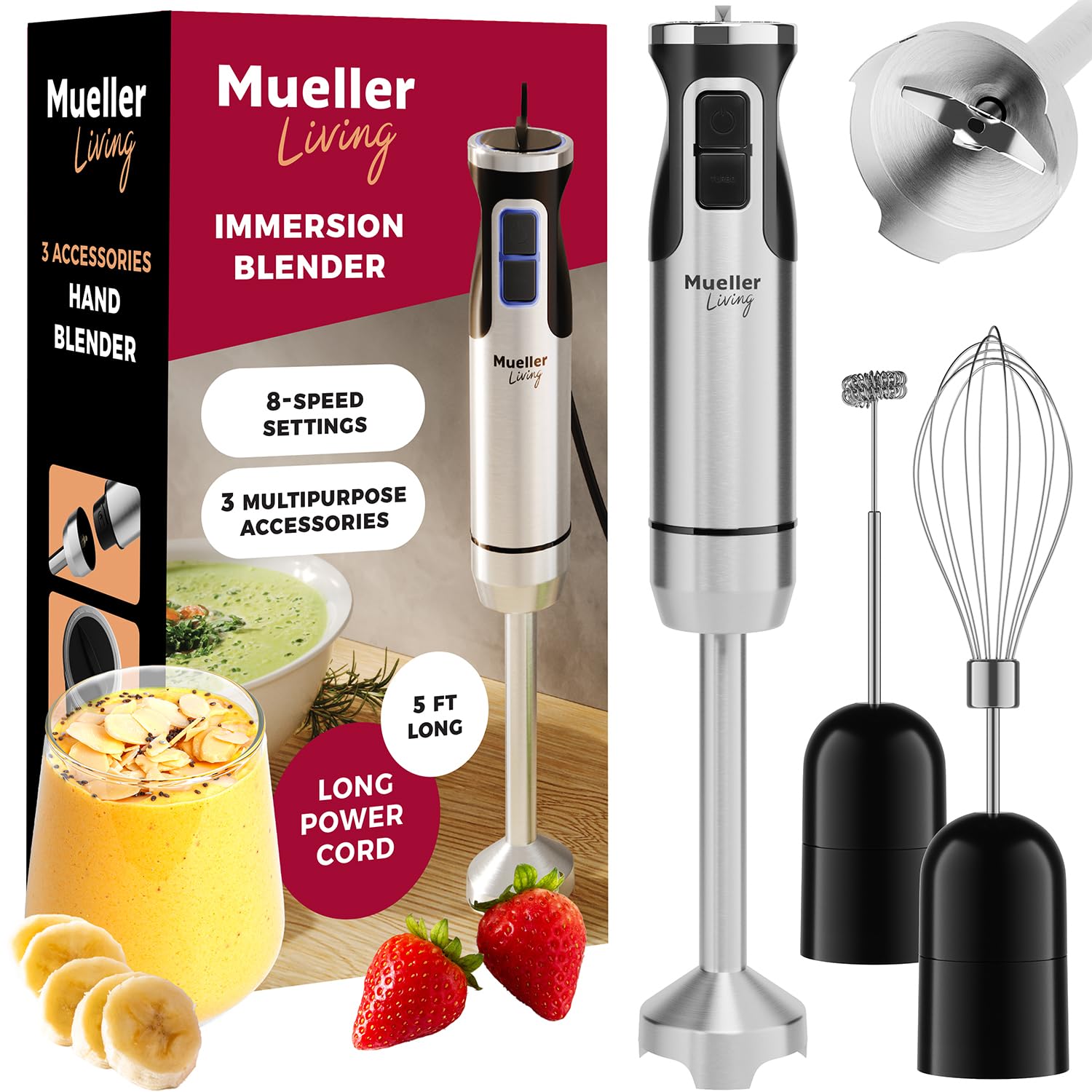 Details: Designed and engineered to outlast and outperform the competition. Comfortable and easy to use, makes all your mixing/blending tasks easier than ever! The Mueller Ultra-Stick 9-Speed hand blender is one countertop appliance with limitless options and versatility. The blending arm reaches perfectly into deeper pots. Let's you blend, puree, and crush with ease. 9 speeds provide control for food, such as, smoothies, soups, or baby food. The blending arm and whisk twist off for quick and easy cleanup.