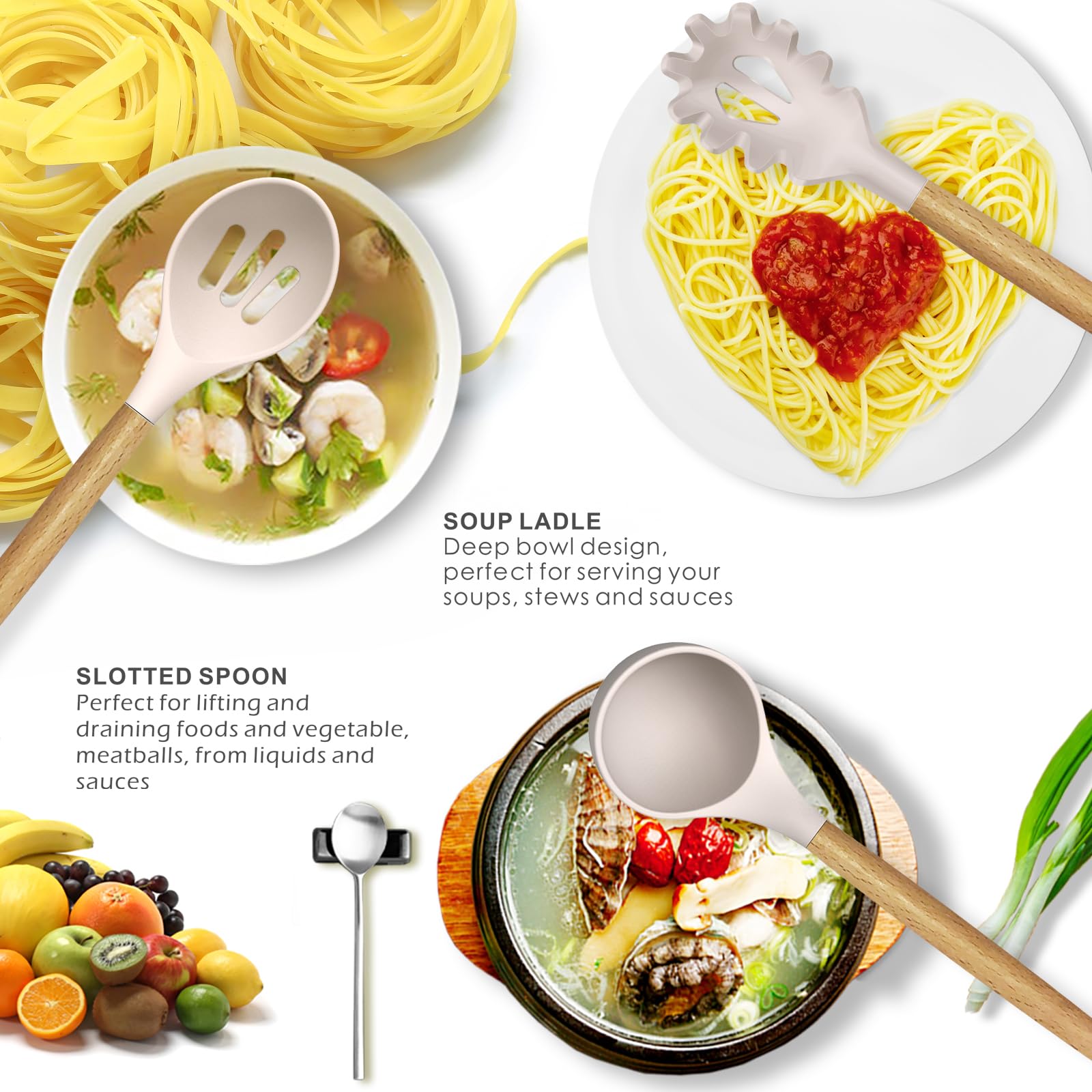- FULLY MEET YOUR KITCHEN NEEDS, NO MORE WASTE OF MONEY - Silicone utensil set includes 9 cooking tools and 4 baking tools, and a large utensil holder. you will have all the essential cooking tools you need in your kitchen. Includes a Deep Soup Ladle, Solid Serving Spoon, Slotted Spoon, Flexible Spatula, Round Spatula, Pasta Server, Slotted Turner, and more. These silicone utensils protect non-stick pans from scratches