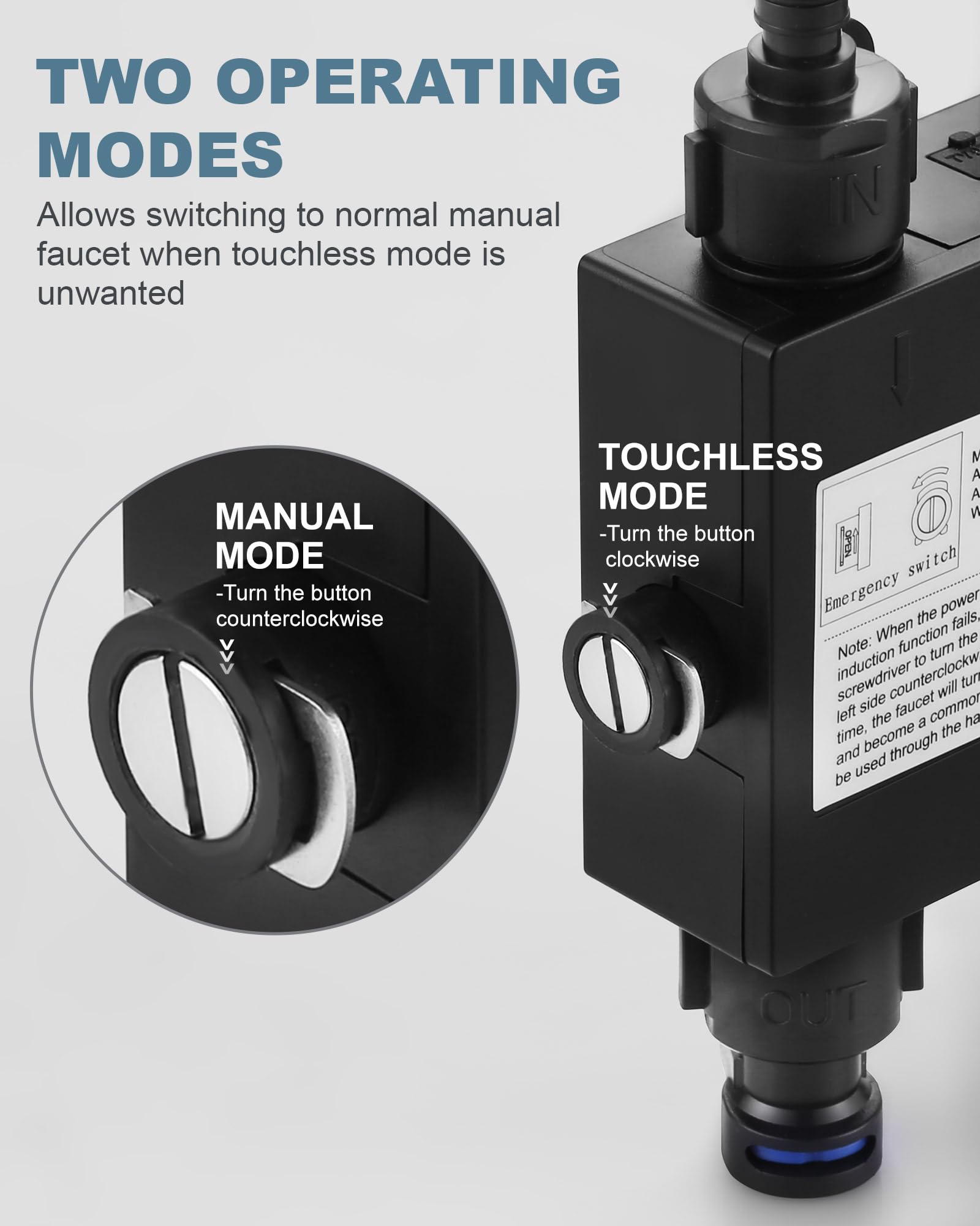 - Switchable To Normal Faucet: By switching the button on the sensor control box, you can easily switch off the touchless mode to the normal touch-by-hand mode for more options. Single handle design, easy to control hot & cold water and flow volume
