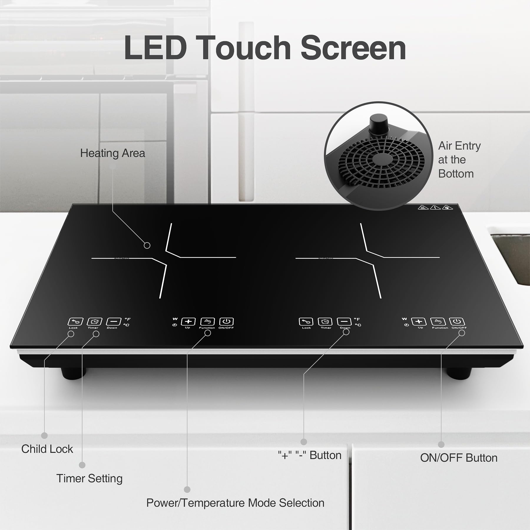 - Double Induction Cooktop:This VBGK portable Induction cooktop is equipped with two independent heating zones, allowing you to set each heating zone separately using the LED display. Each burner is 2000W, which can quickly cook 2 dishes at the same time, saving a lot of time.