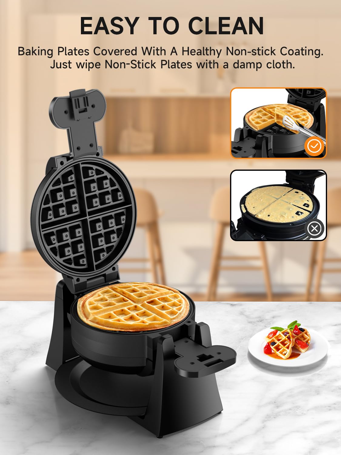 - 【180°ROTATING SYSTEM】The rotating Belgian waffle maker‘s convenient 180° flip system allows the batter to fully coat the cooking plates for even heat distribution, so you end up with evenly-cooked fluffy waffles, browned on both the top and the bottom with no bald spots