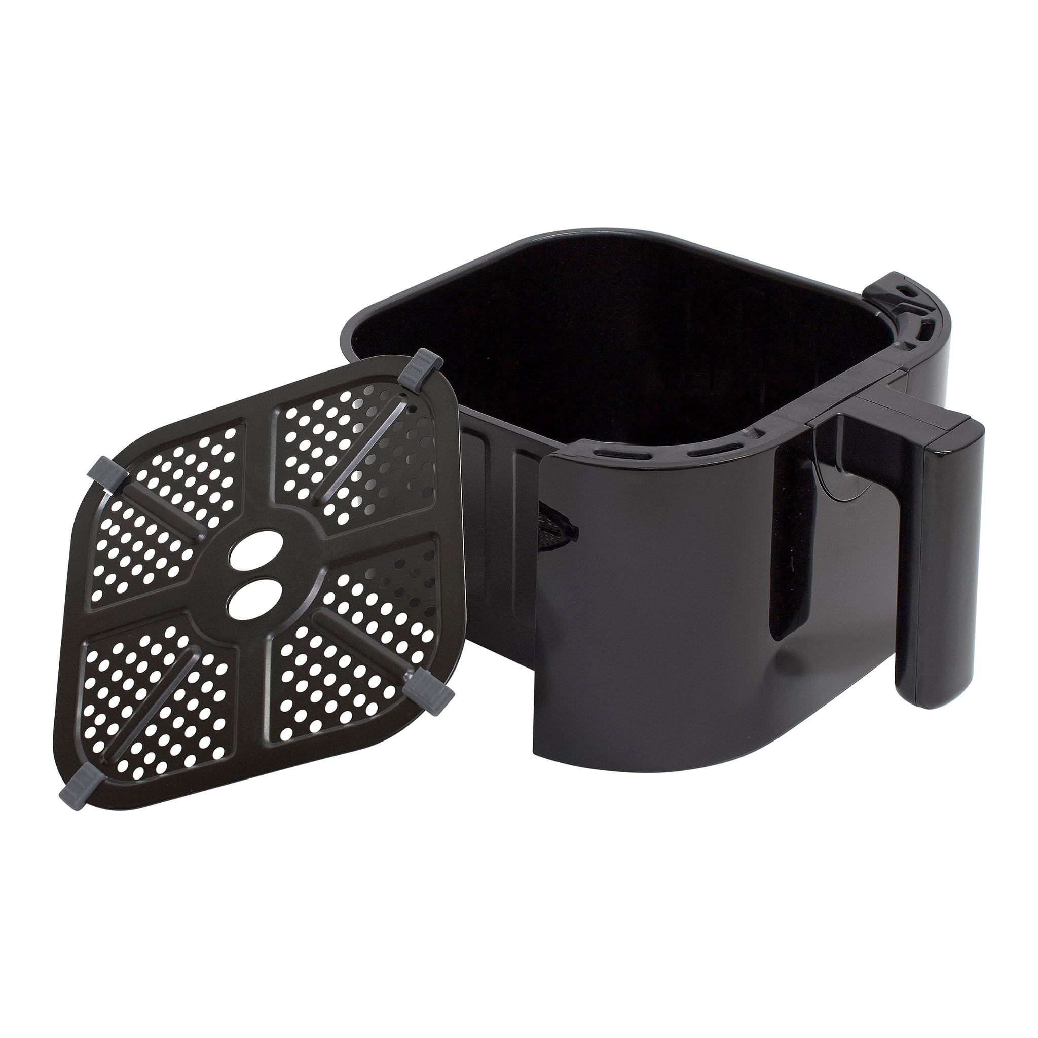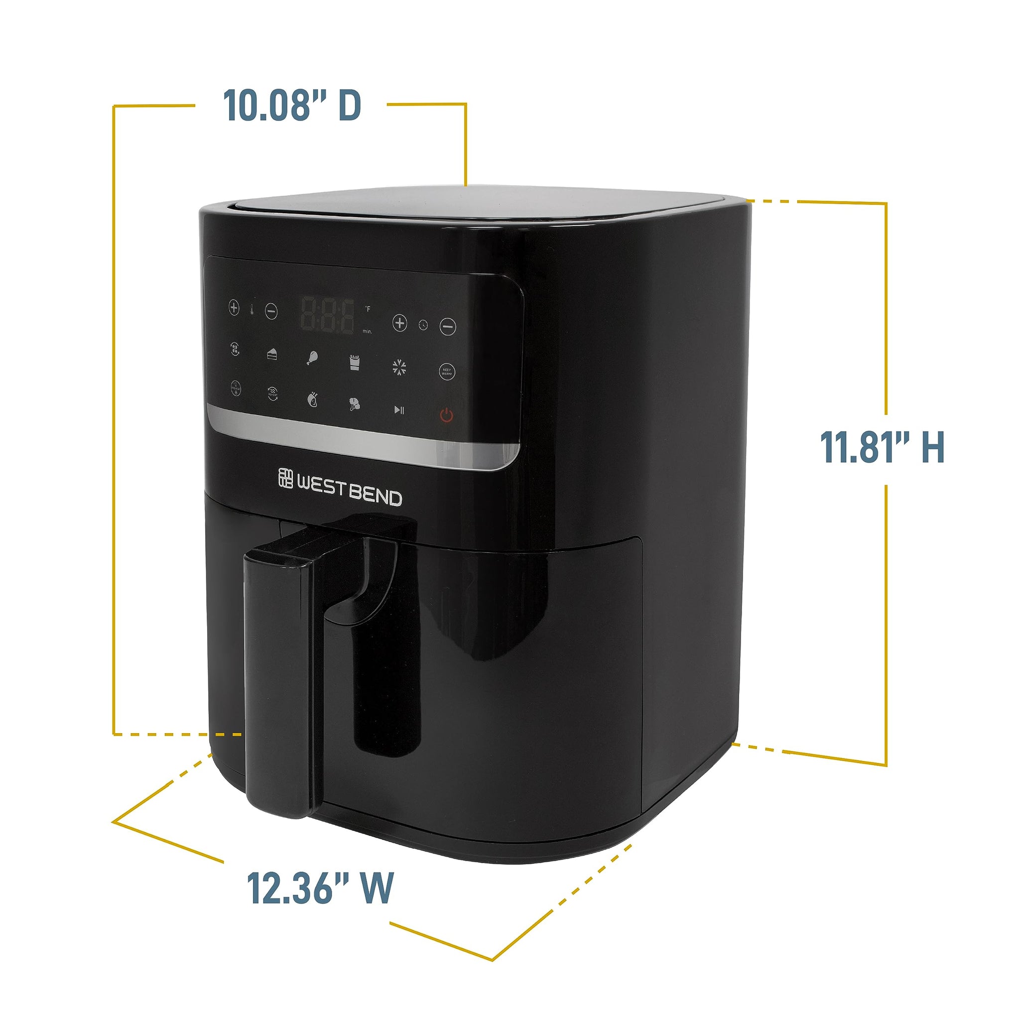Details: Discover a quick and easy way to cook healthier, delicious food with the West Bend Air Fryer. With a 5-quart capacity, you can enjoy the crispy taste you love using very little to no oil. Take the guesswork out of making your favorite foods to crispy perfection with 10 one-touch preset functions (Air Fry, Bake, Chicken, Fries, Frozen, Keep Warm, Preheat, Reheat, Roast, Vegetables). The LCD digital display is easy to read while you are cooking, and the shake reminder alerts you when it's time to turn or shake the food for more even cooking. The frying basket features our strong, PFOA/PFOS-FREE, Diamond Shield™ infused coating that provides scratch-resistant durability and prevents foods from sticking for easy clean up. The easy-to-grip, ergonomic handle is cool to the touch, making it safe to grab while cooking. This compact air fryer will fit perfectly on your countertop or under your kitchen cabinets, and the sleek look complements any kitchen décor.