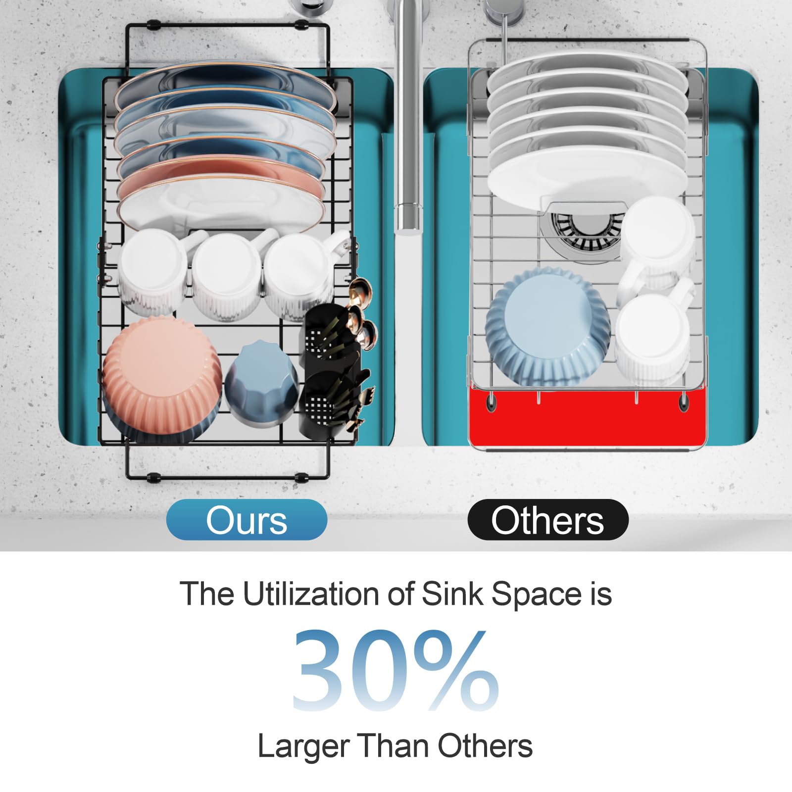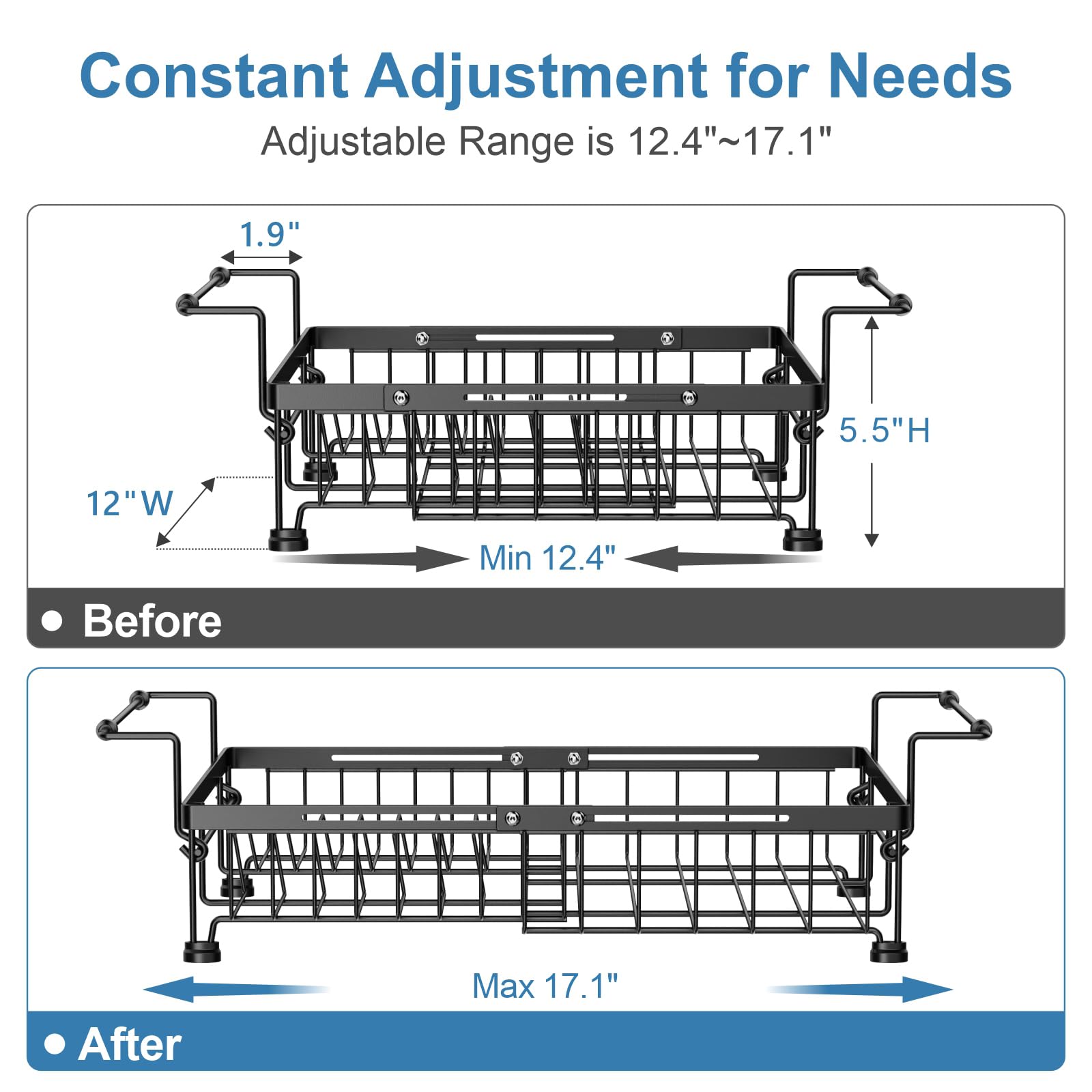 - [Innovative "Expandable Capacity" Design] - Unlike other in sink dish drying rack that only allow for handle adjustments and waste space, ours can adjust the main body rack to increase 37% storage capacity. Product dimensions: (12.4''-17.1'') L x 12''W x 5.5''H(not including handle length)