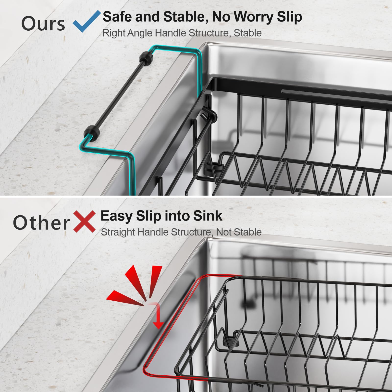 - [Safe and Stable, Worry-free Use] - The sink drying rack is designed with a right-angle sink handle, which is more stable and not easy to slip than a straight handle structure; Both sides of the handle are equipped with anti-slip beads to ensure a stable grip on the sink; The dish drainers for kitchen sink also has non-slip rubber feet to protect your counter and sink from scratches