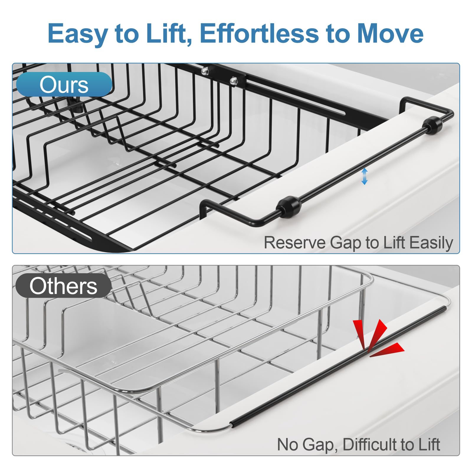 - [Practical Handles - One-Time Quick Move] - Unlike other products that require the handle to be shortened each time for movement in or over the sink, our over sink dish drying rack allows for direct lifting of the handles for position adjustment, which is fast, time-saving, and convenient. Additionally, the raised anti-slip beads on the handle ensure a sufficient gap between the countertop and handle for easy lifting