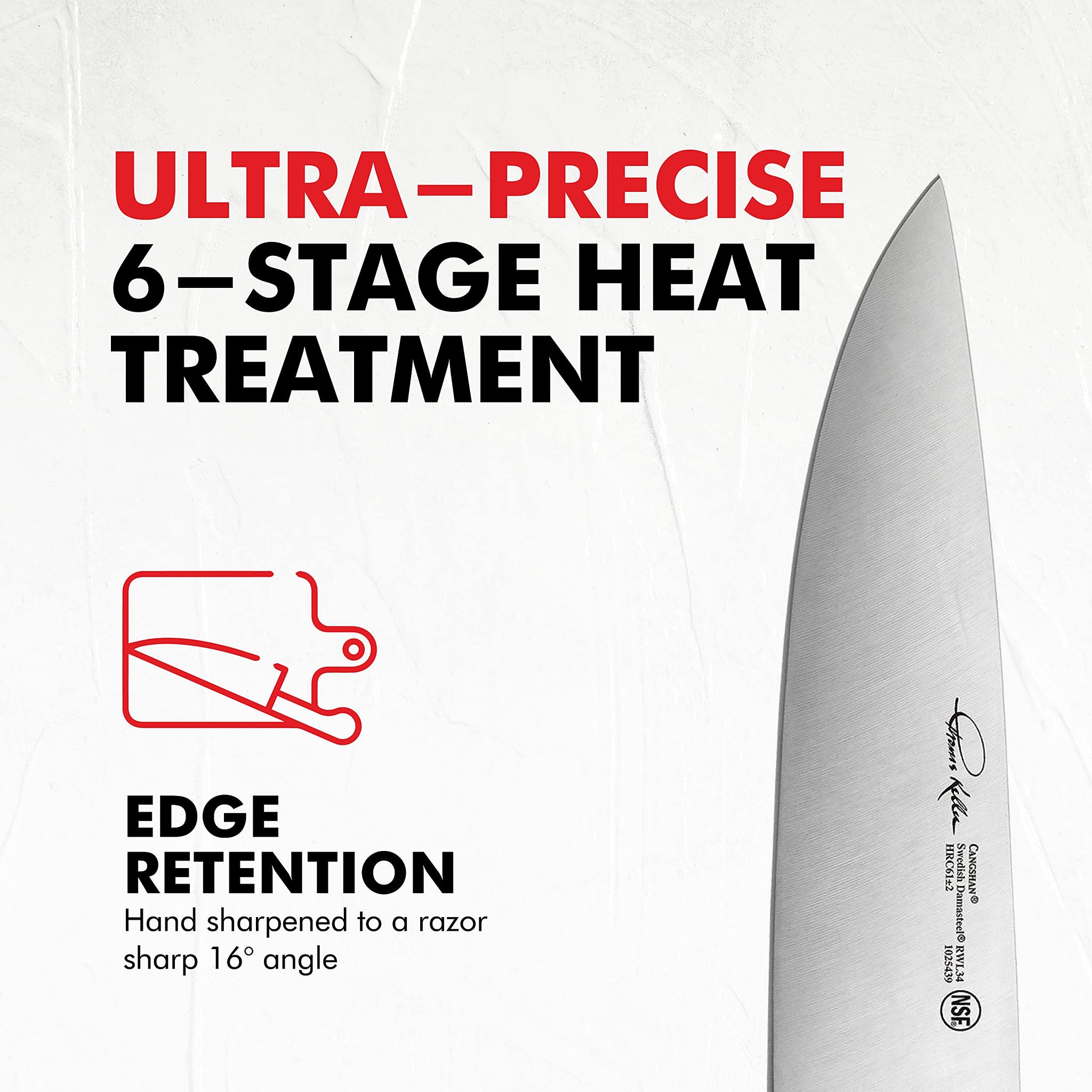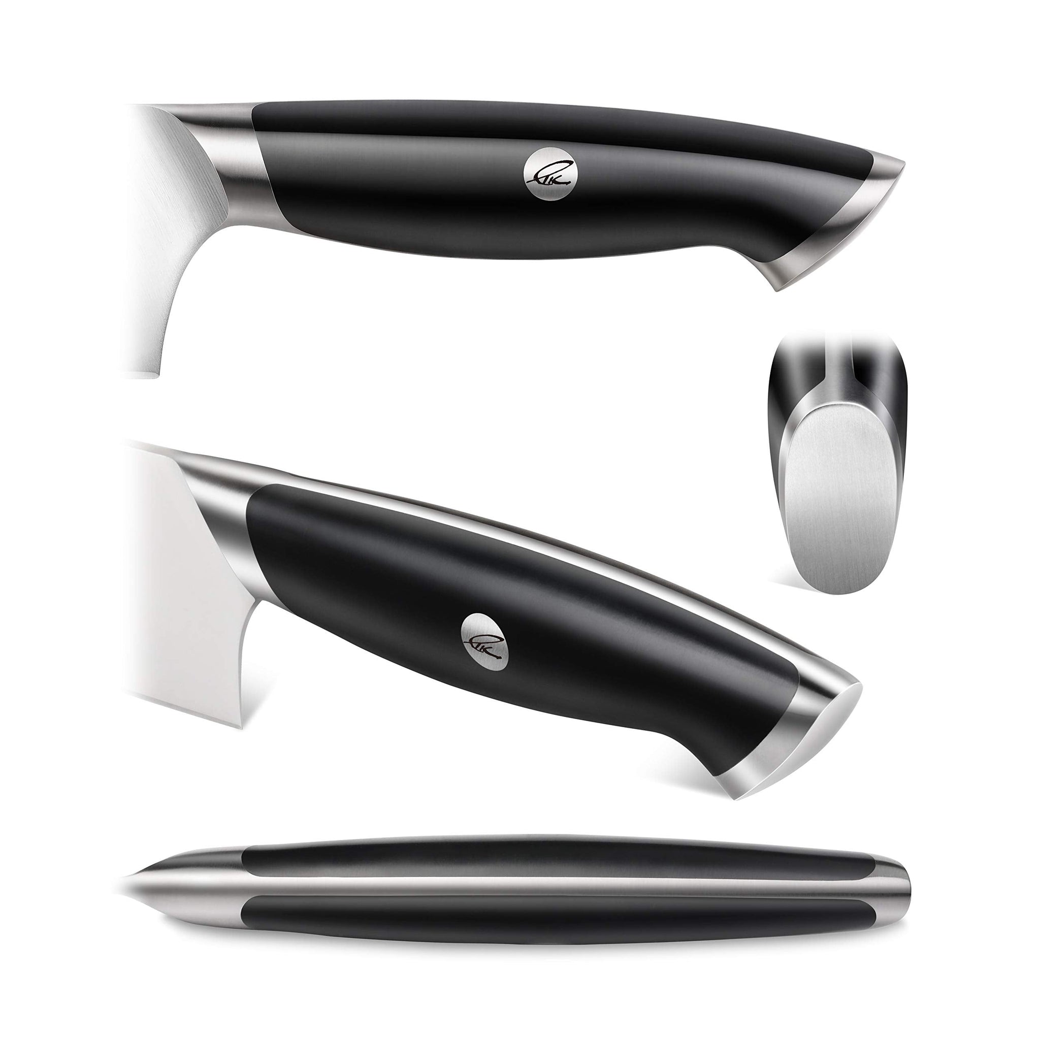 - Designed by Michelin-starred chef Thomas Keller. Single large rivet features Thomas Keller's initials. 17-piece set includes:2 3/4" peeling knife, 3 1/2" paring knife, 5" serrated utility knife, 5" tomato/cheese knife, Six 5" fine-edge steak knives, 6" boning knife, 7" santoku, 8" bread knife, 8" chef's knife, 8" honing steel, All-metal kitchen shears, and 16-slot walnut knife block. Please note: Storage block is counted as an individual piece.