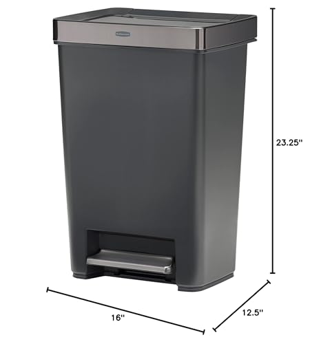 Details: The Rubbermaid Premier Series IV Step-On Container elevates your space with its sleek, modern design. The container features a charcoal stainless-steel lid, rim and foot pedal to complement kitchen appliances and the fingerprint resistant coatings ensure a clean, premium look and feel to the container throughout the day. The flared anti-slide base adds a simple design element to mirror modern kitchen appliances while increasing container stability and the lid lock feature allows you to keep the lid opened for longer tasks or closed to keep out pets and children. Integrated Linerlock(TM) holds bags in place, while the premium stainless-steel rim hides liner bags to keep a clean look.