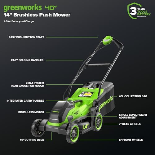 Details: Greenworks 40V 14" Brushless Mower delivers reliable performance for homeowners who need a lightweight yet powerful mower for their lawn care needs. Powered by a 40V lithium-ion battery, this mower ensures longer runtime with no gas, oil, or emissions—making it an eco-friendly choice for your lawn.