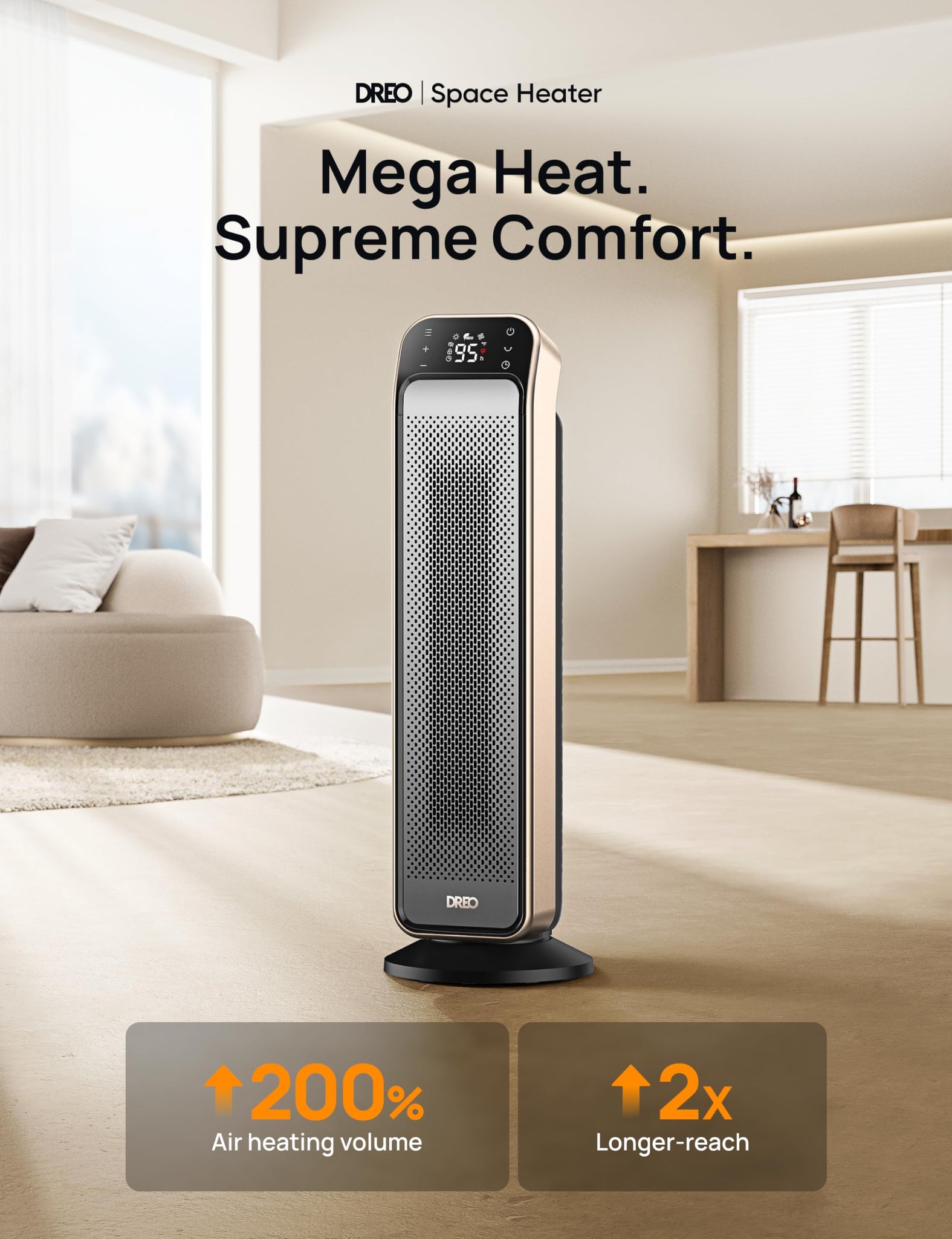 • The Ultimate Heating Experience: Dreo's upgraded 25" ceramic space heater brings 11.5 ft/s fast heat thanks to its new hyperamics thermal design, while the extended impeller doubles the heat range making it the ideal space heater for large rooms and warmer winters.