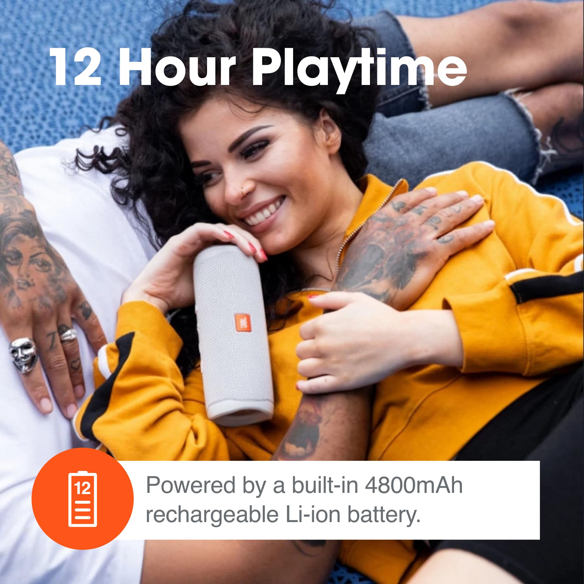 • 12 HOURS OF PLAYTIME - Don't sweat the small stuff like charging your battery. Flip 5 gives you up to 12 hours of playtime. Keep the music going longer and louder with JBL's signature sound.