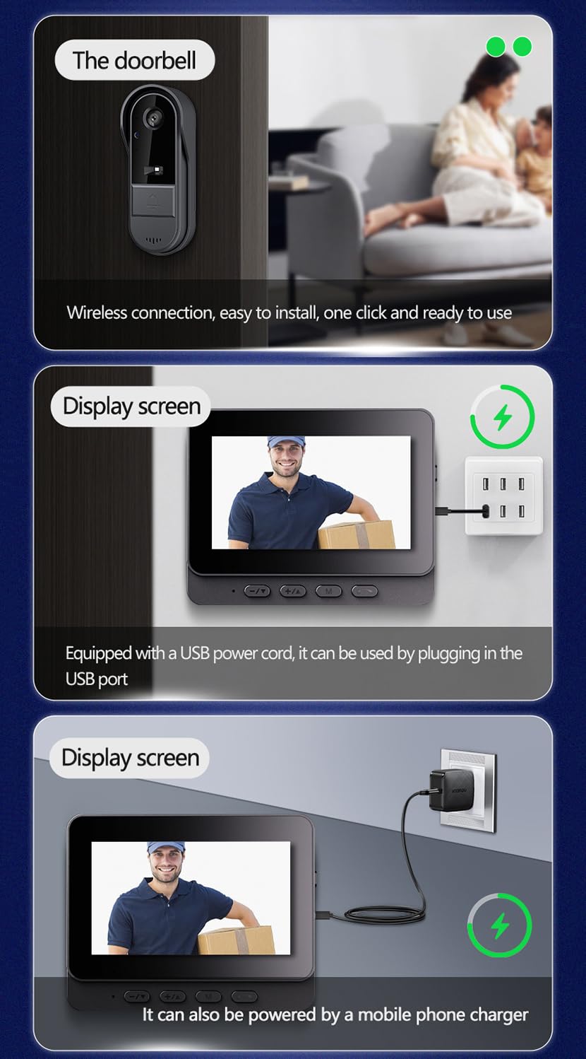 - 【4.3“ IPS Screen & Automatic Capture or Video Recording】The door bell camera automatically snapshots or records when a visitor presses the button and save it on the TF card (not included). You can view them on the 4.3“ large screen clearly.
