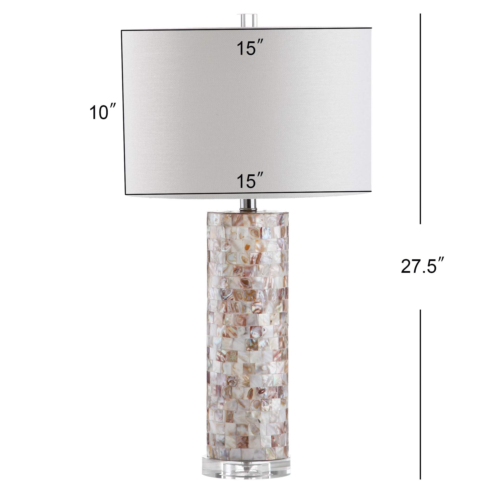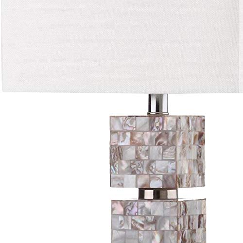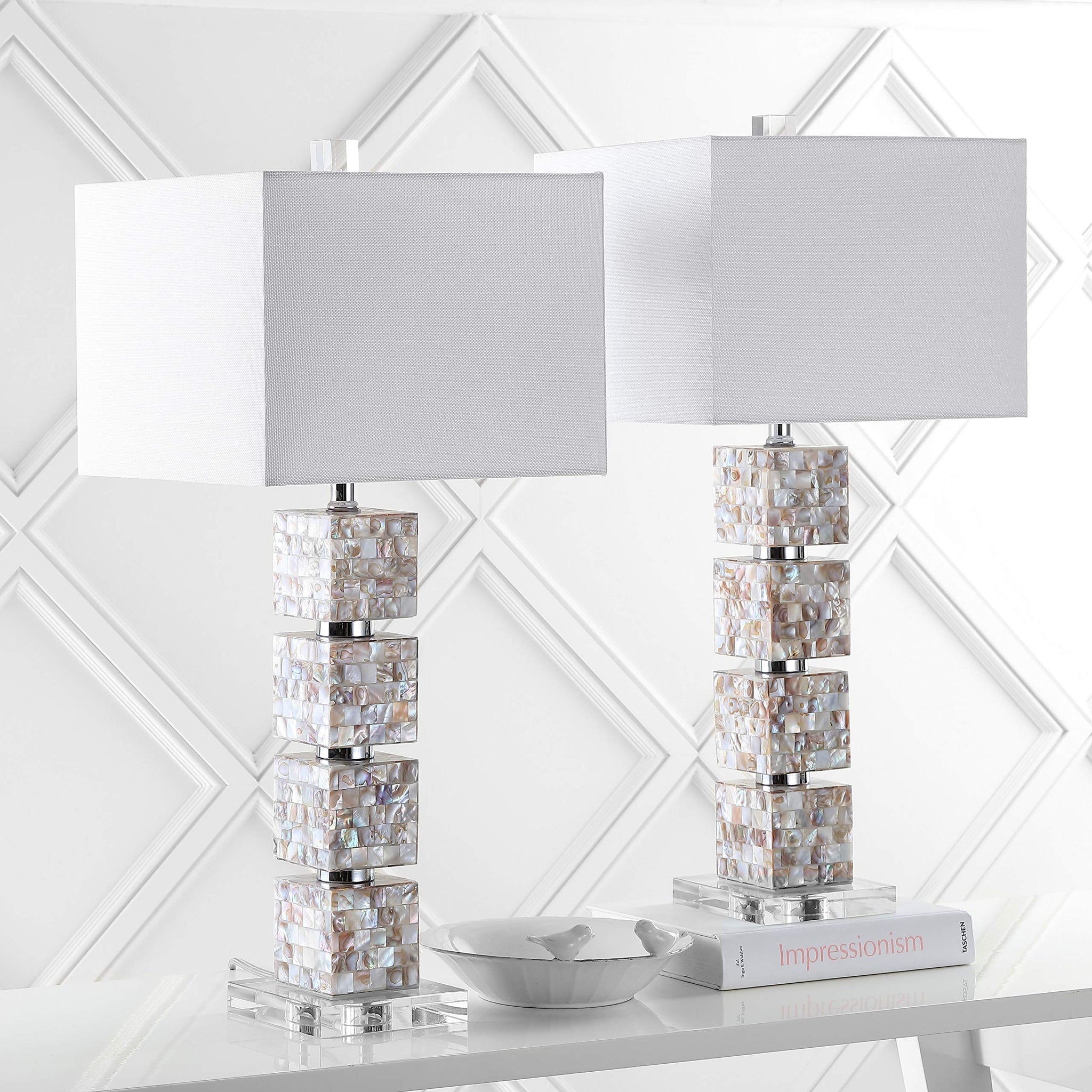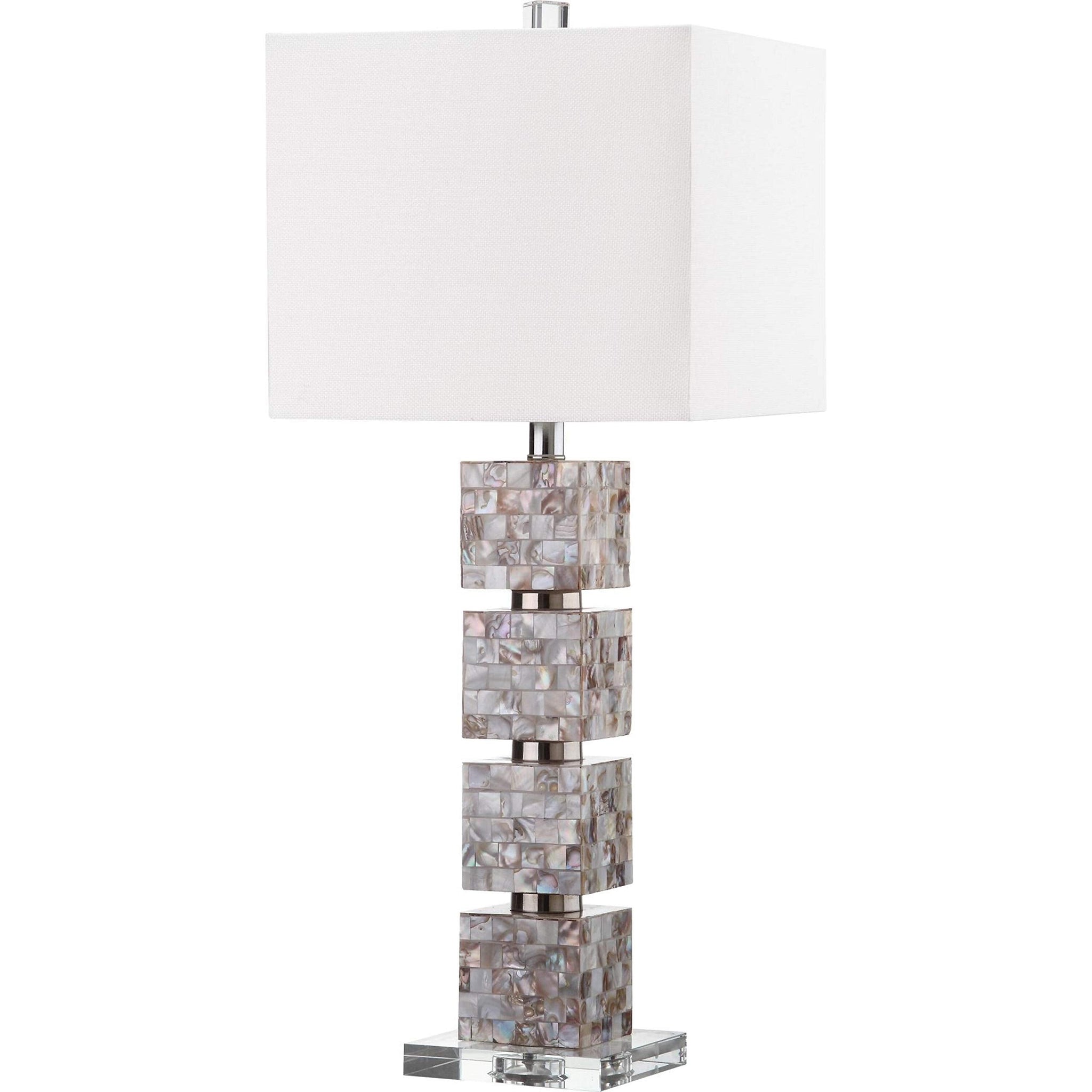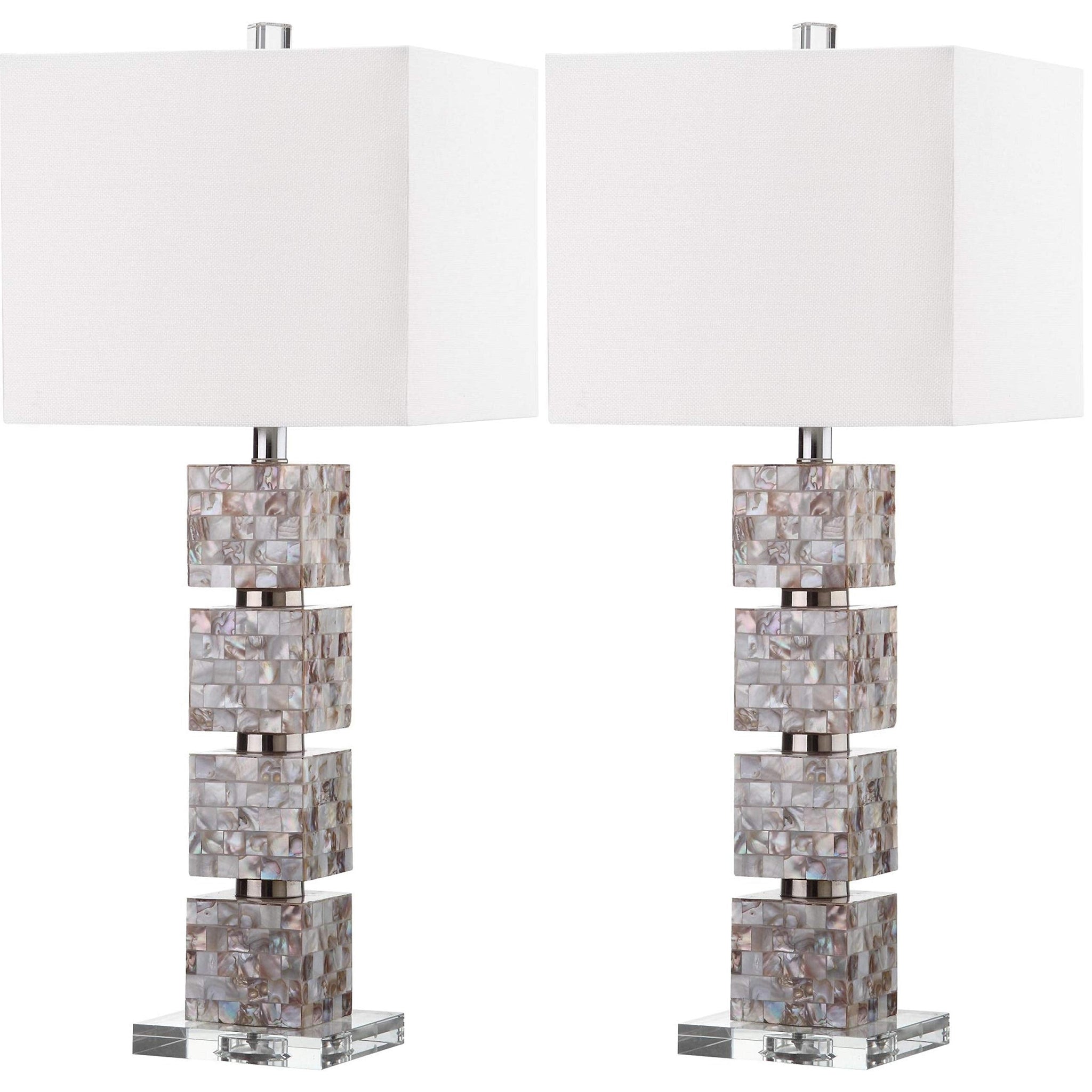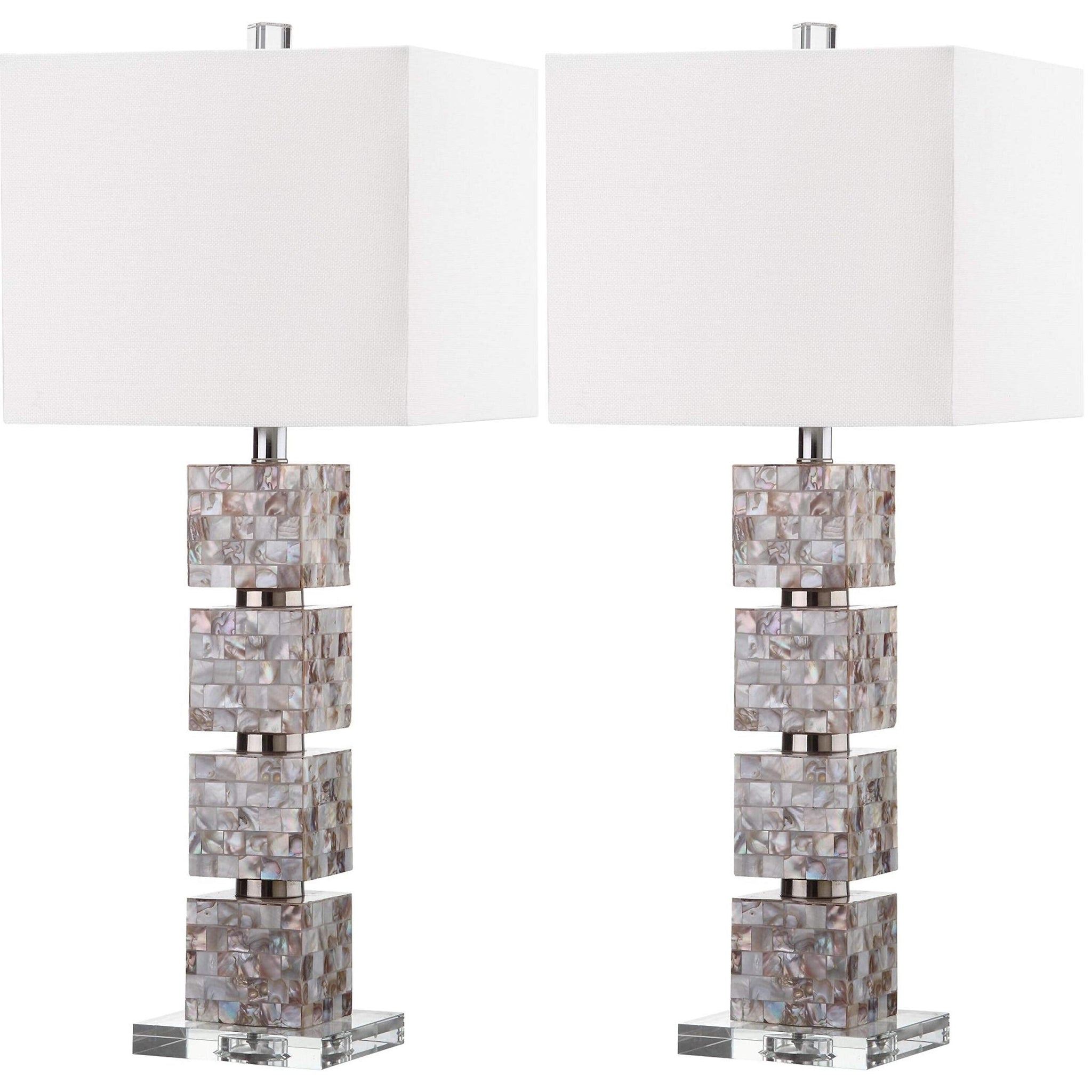 Details: The Rafferty table lamp is striking with a graphic tower effect created with blocks finished in cream toned mosaics of natural shell and alternating clear acrylic disks. This sophisticated set of two lamps is topped with a white textured cotton shade.