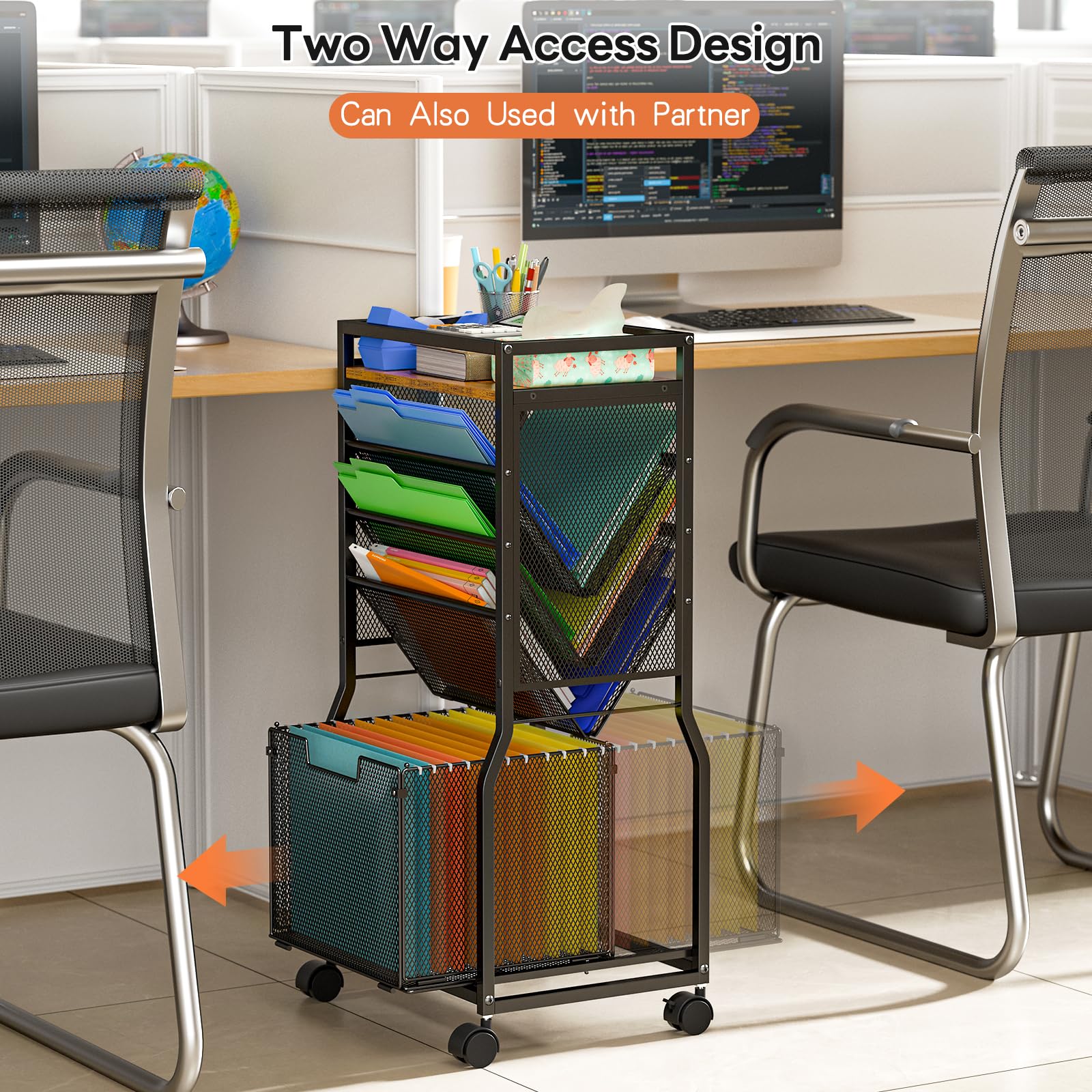 - ✅【Dual-Sided Access Design】The mobile file cart with 6 tray layers, which designed for dual-sided access, allowing you and your colleagues to easily retrieve files from either side. Our file organizer cart also comes with a hanging file basket that can be pulled from both directions, making office organization more convenient and tidy.