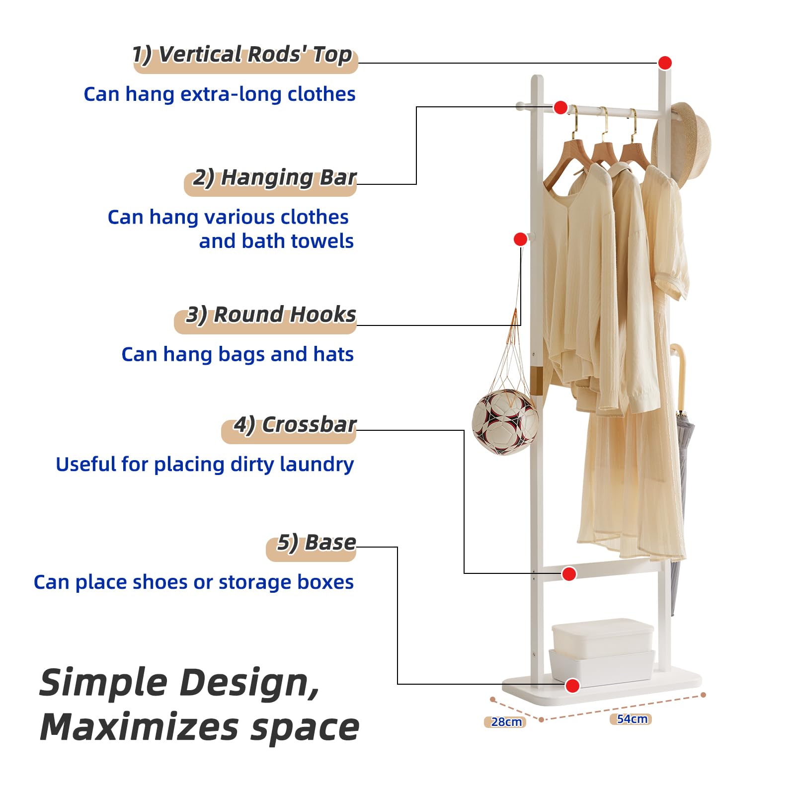 - STABLE AND STURDY: The clothing rack is made of solid rubber wood, with base size 54x28x2.5cm that is thick and heavy duty, make sure sturdiness with load-bearing 8 lb each hook, 20 lb for top rod and 22 lb on main rods' top