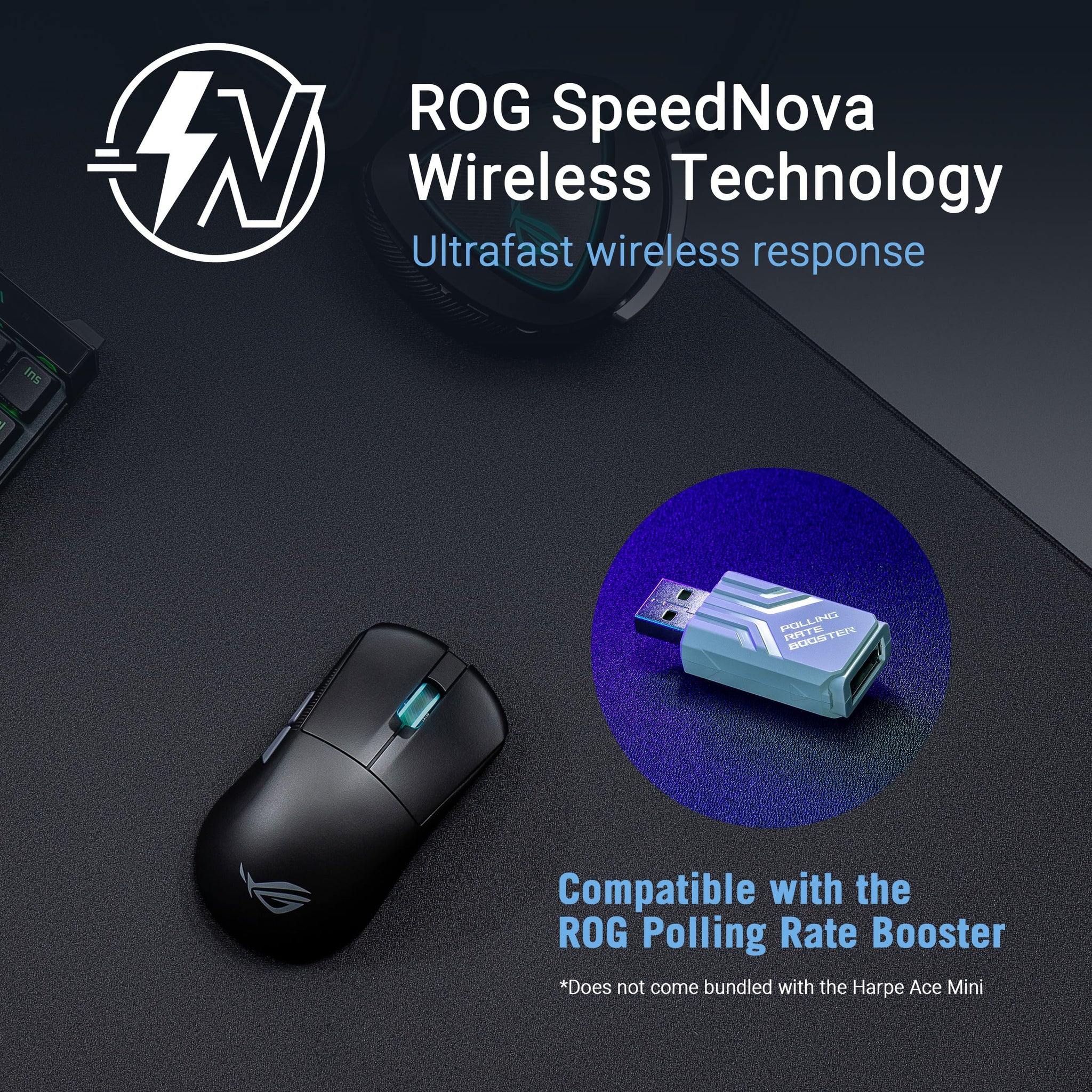 Details: The ROG Harpe Ace Mini is an ultralight 49-gram semi-symmetrical gaming mouse with a shape approved by pro FPS players. Equipped with 42,000-dpi ROG AimPoint Pro optical sensor and ROG Optical Micro Switches, the ROG Harpe Ace Mini displays industry-leading wireless performance with SpeedNova wireless technology and supports up to 8,000 Hz wireless polling rate (compatible with the ROG Polling Rate Booster).