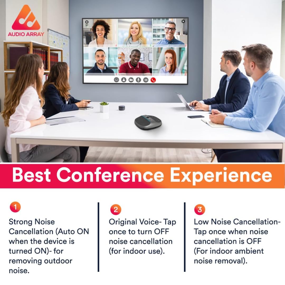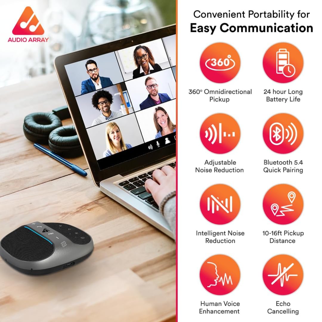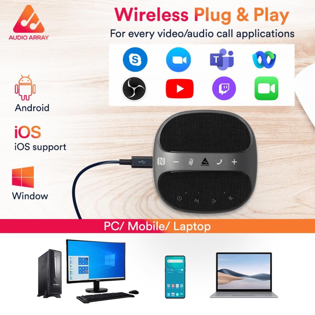 - 🎤 360° Omnidirectional Voice Pickup & Pickup Distance 10-16Ft Bluetooth/USB-C conference speakerphone is equipped with 4 Array mics. 360° voice pickup could be easily achieved. 10-16Ft voice pick-up range makes the Conference Voice Clear, natural and more efficient.