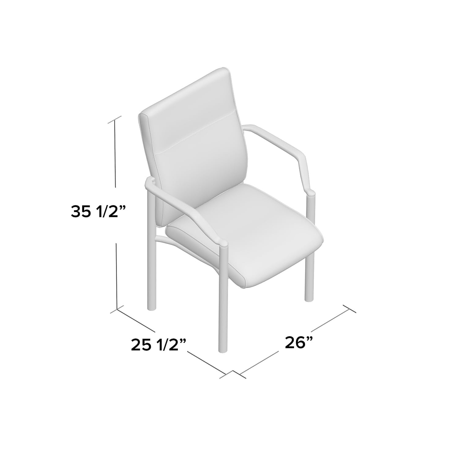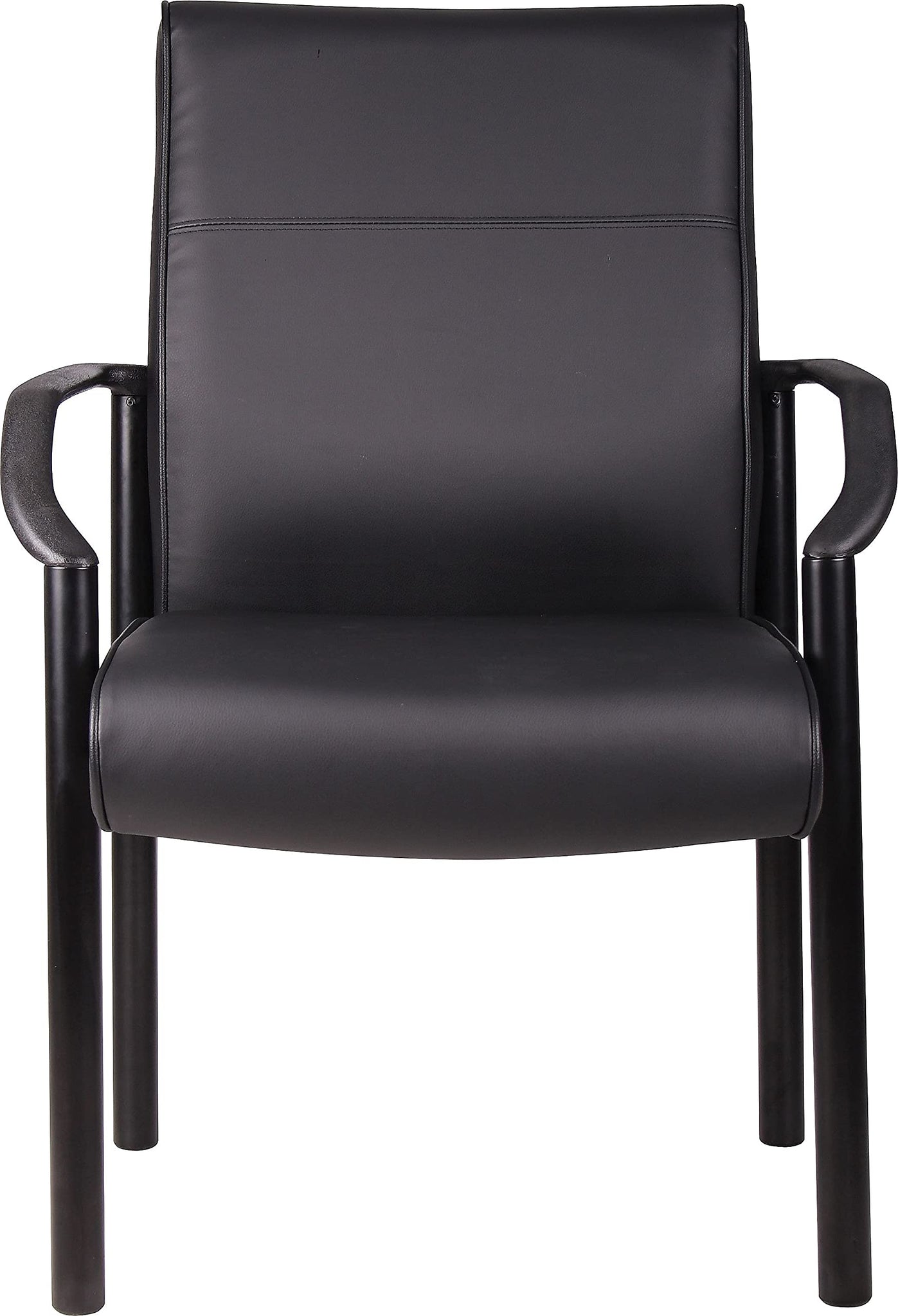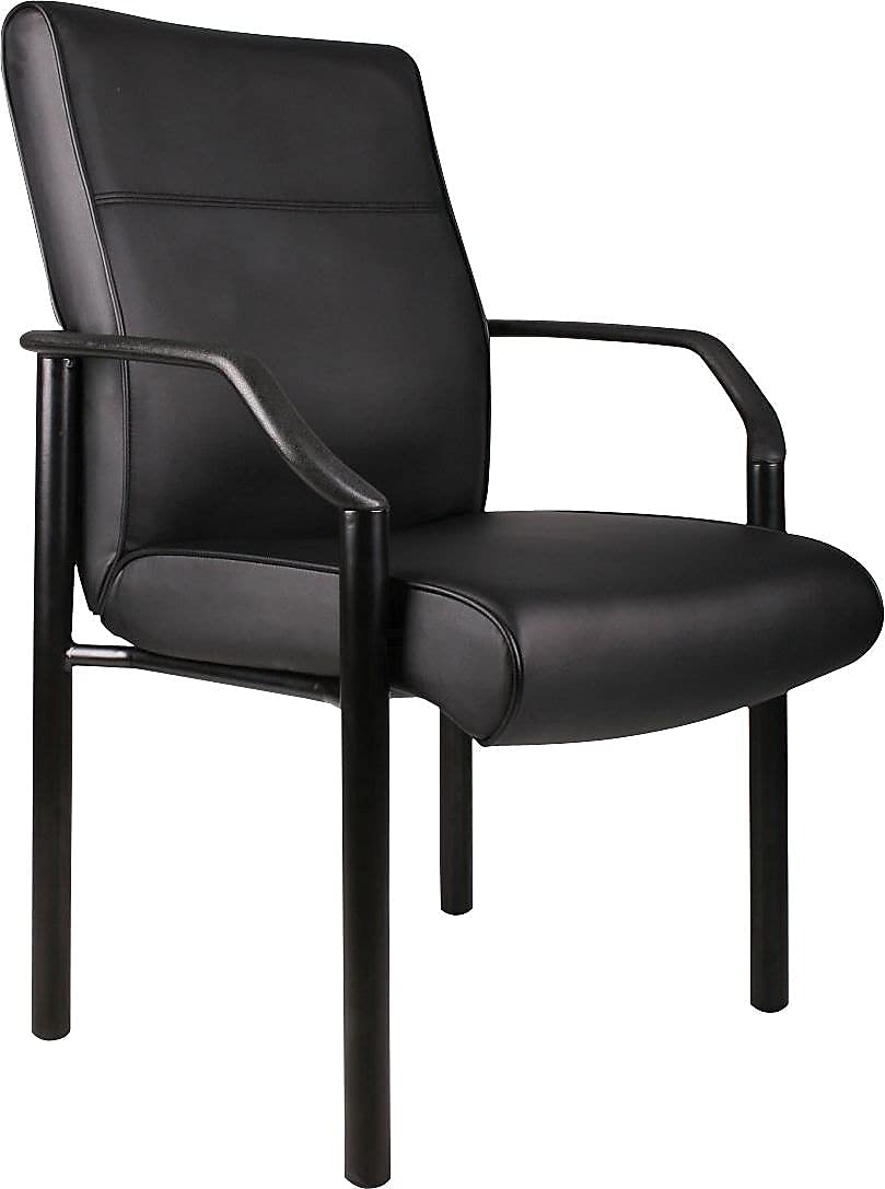 Details: Both classy and simple, the Boss Mid Back Guest Chair In LeatherPlus by Boss Office Products weighs 30 pounds and is easy to assemble after arrival. The chair has a capacity of 250 pounds and measures 26" W x 25.5" D x 35.5" H. LeatherPlus is the unit's biggest and most attractive feature. This technology infuses polyurethane with the leather to create a softness that makes working long hours more comfortable. It is also very durable, so you can expect it to last. The chair comes in black and has an ergonomic design that is great for your back. Users are welcome to also pick up model B686, which is a matching chair that has powder-coated steel legs.