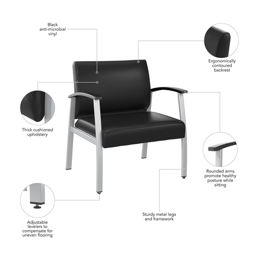 Details: The Bush Business Furniture Arrive Bariatric Guest Chair with Arms is perfect for treating your visitors to a reception area that's stylish, practical, and comfortable. Highlighted by its commercial quality build and thick cushioned upholstery, this durable waiting room chair is right at home in a commercial workplace, doctor's office, hospital, school, salon, or any other high-use common area. An ergonomically contoured backrest and rounded arms are designed to reduce stress and discomfort by promoting good posture. Sturdy metal legs and framework allow the big and tall guest chair to support up to 450 pounds, and levelers are included to compensate for uneven flooring. The padded seat is quick and easy to clean and resists cuts and tears while conveying a modern professional appearance. This extra large office reception chair has been meticulously tested to meet or exceed ANSI/BIFMA quality standards for safety, durability, and performance and is backed by the Bush Business Furniture 5 Year Manufacturer's Warranty. Complete your organization's waiting room furniture set with the Arrive Guest Chair, Loveseat, Reception Desk and more (coordinating items sold separately).