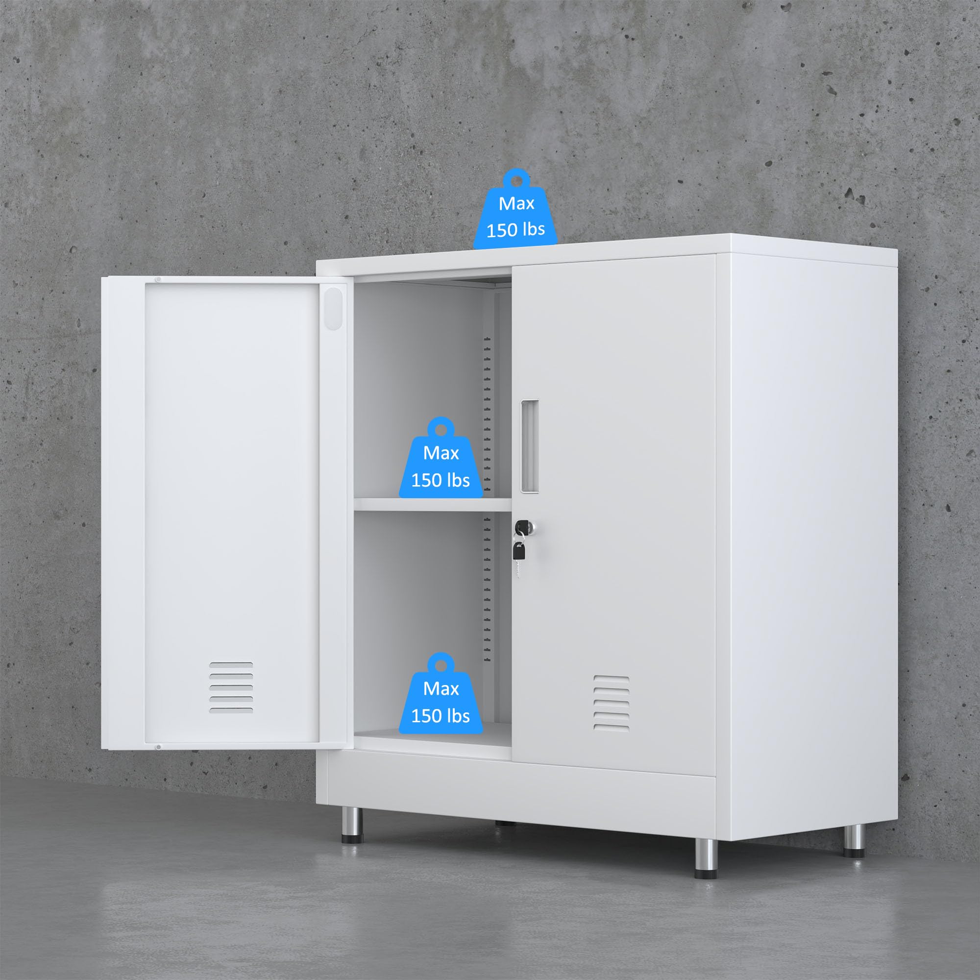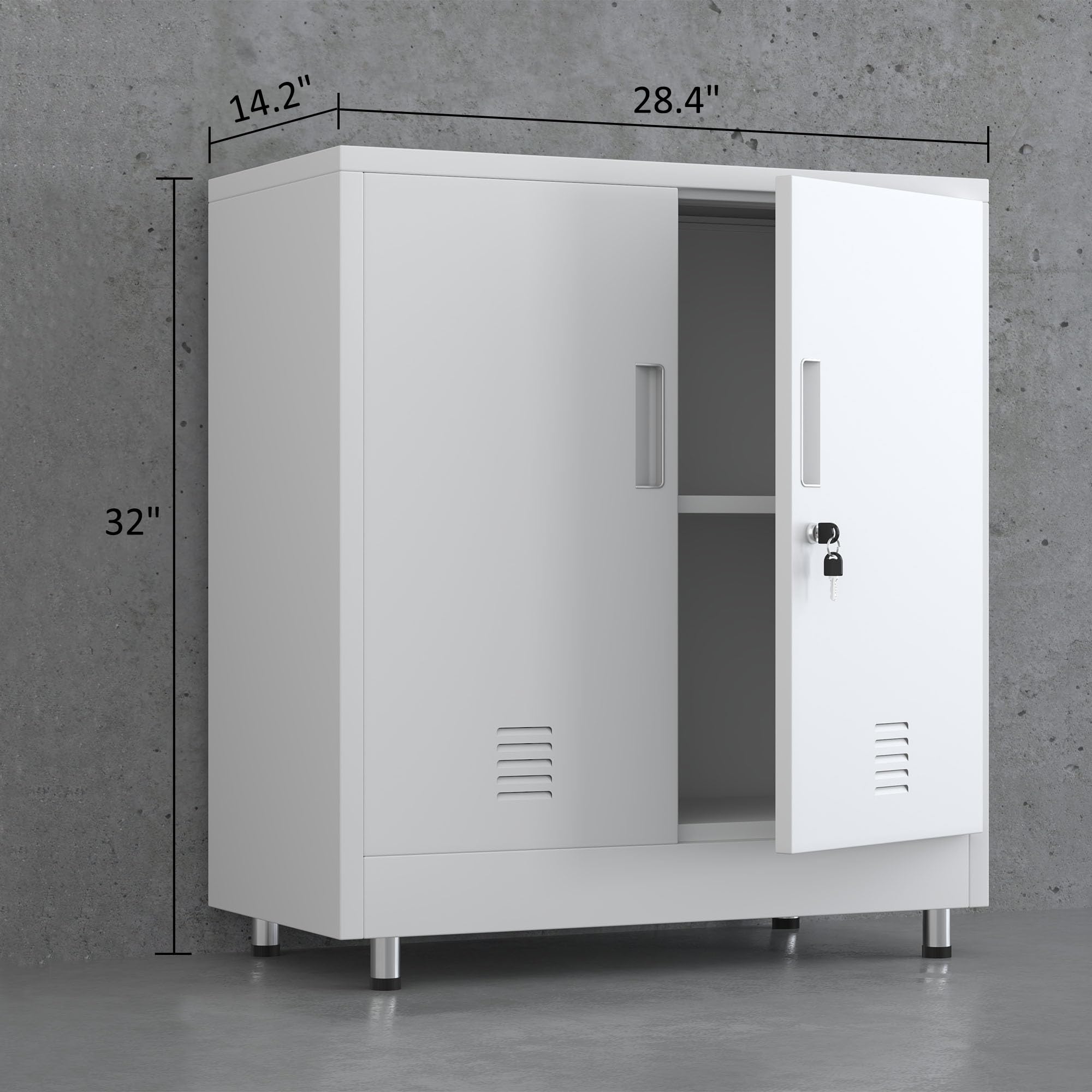Details: Product DetailsMaterial: Alloy SteelSurface finish: Odorless, pollution-free and recyclable powder coatingWith 1 height adjustable shelfTwo lockable wing doors with secure locking system and 2 keysReinforced box construction makes the storage cabinet sturdy and durableEasy-to-clean interior due to smooth compartment floorProduct SpecificationsProduct Dimensions: 31.9"H x 28.4"W x 14.2"DPackage Dimensions: 31.5" x 18.5" x 5.9"Shelf Size: 31.4''W x 14.2''D x 0.8"HOverall Package Weight: 44 LbsOverall Product Weight: 33 LbsIn the box 1 lockable metal storage cabinet1 adjustable shelf2 keys2 Tipover restraint kit4 Legs2 Spare parts kit for Installation1 Assembly Instruction