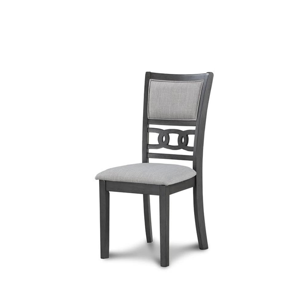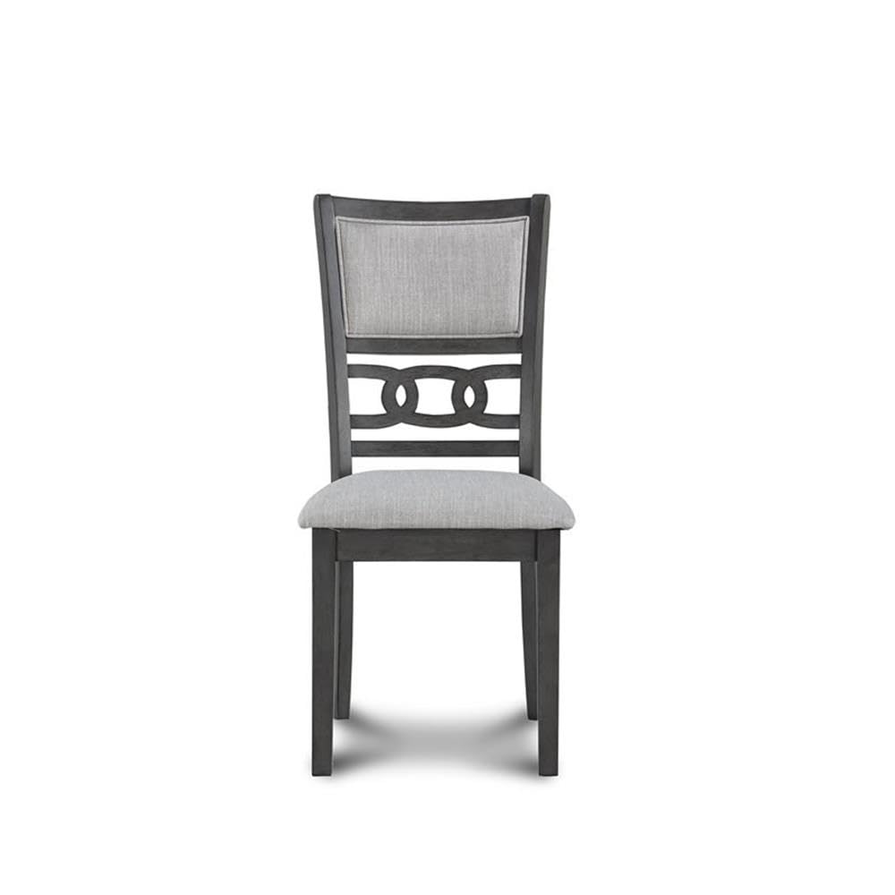 - 4 Dining Chairs: Upholstered Dining Chairs constructed of Solid Wood with Padded Seats and Backs in Coordinating Light Gray Polyester Fabric.