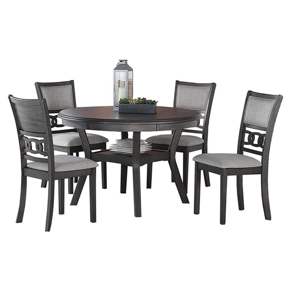 Details: Enjoy 4 Person Dining with the New Classic Furniture 47” Round Mitchell Dining Table Set. This New Classic Dining Table Set comes with four matching solid wood Dining Chairs. The substantial wood dining table apron supports a beautiful table top enhanced with fancy face reverse diamond patterned veneers. The solid legs of the dining table flare in and support a handy storage shelf suitable for dinnerware or decorative accessories. Distinctive Dining Chairs have nicely padded seats with attractive double diamond pattern wood backs. Available in Modern Smokey Gray, Traditional Cherry, and Farmhouse Two Tone White & Brown Finishes.
