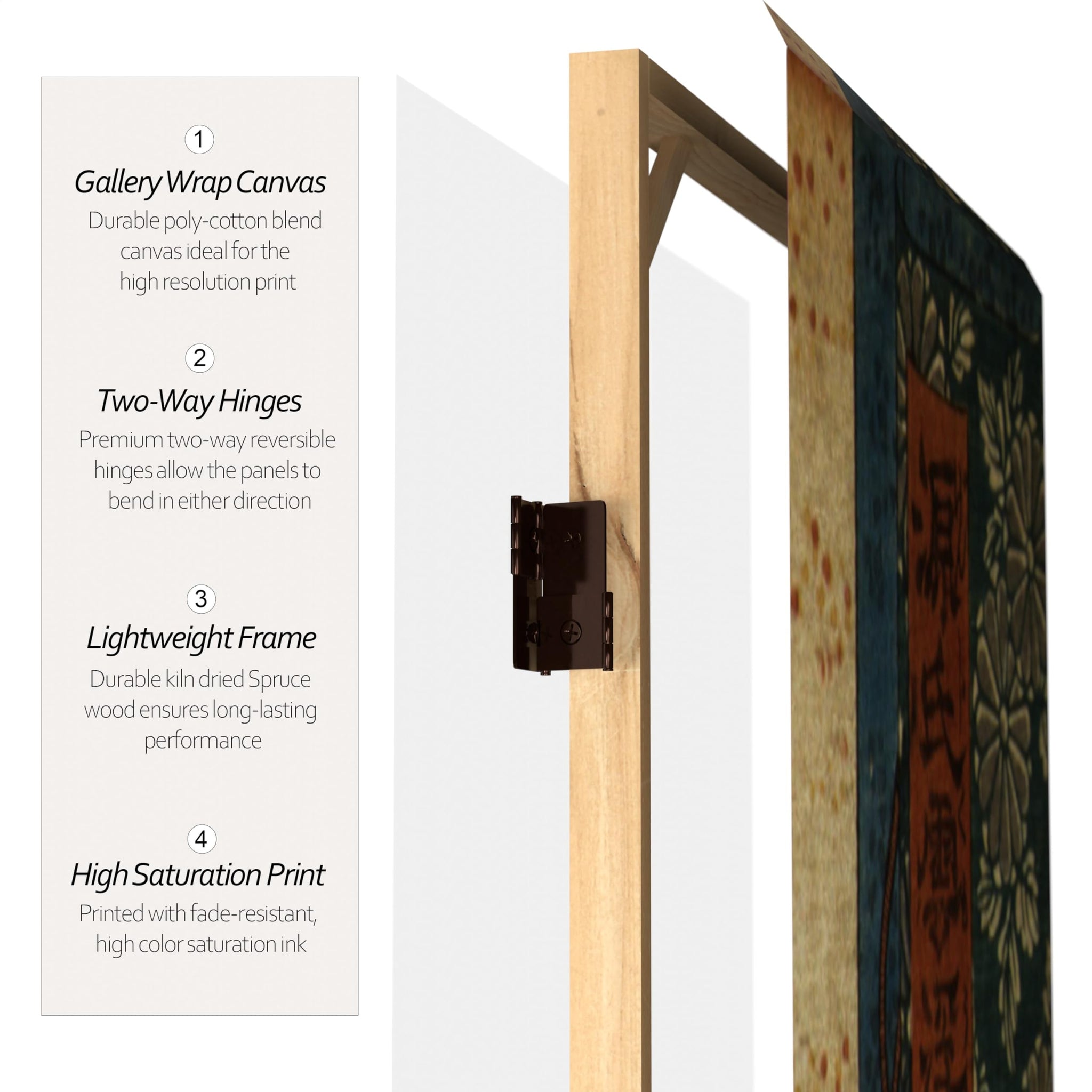 - High quality wood and fabric covered room divider. Constructed with extra durable kiln dried Spruce wood frame panels, and covered top to bottom, front, back, and edges with tough stretched poly-cotton blend canvas