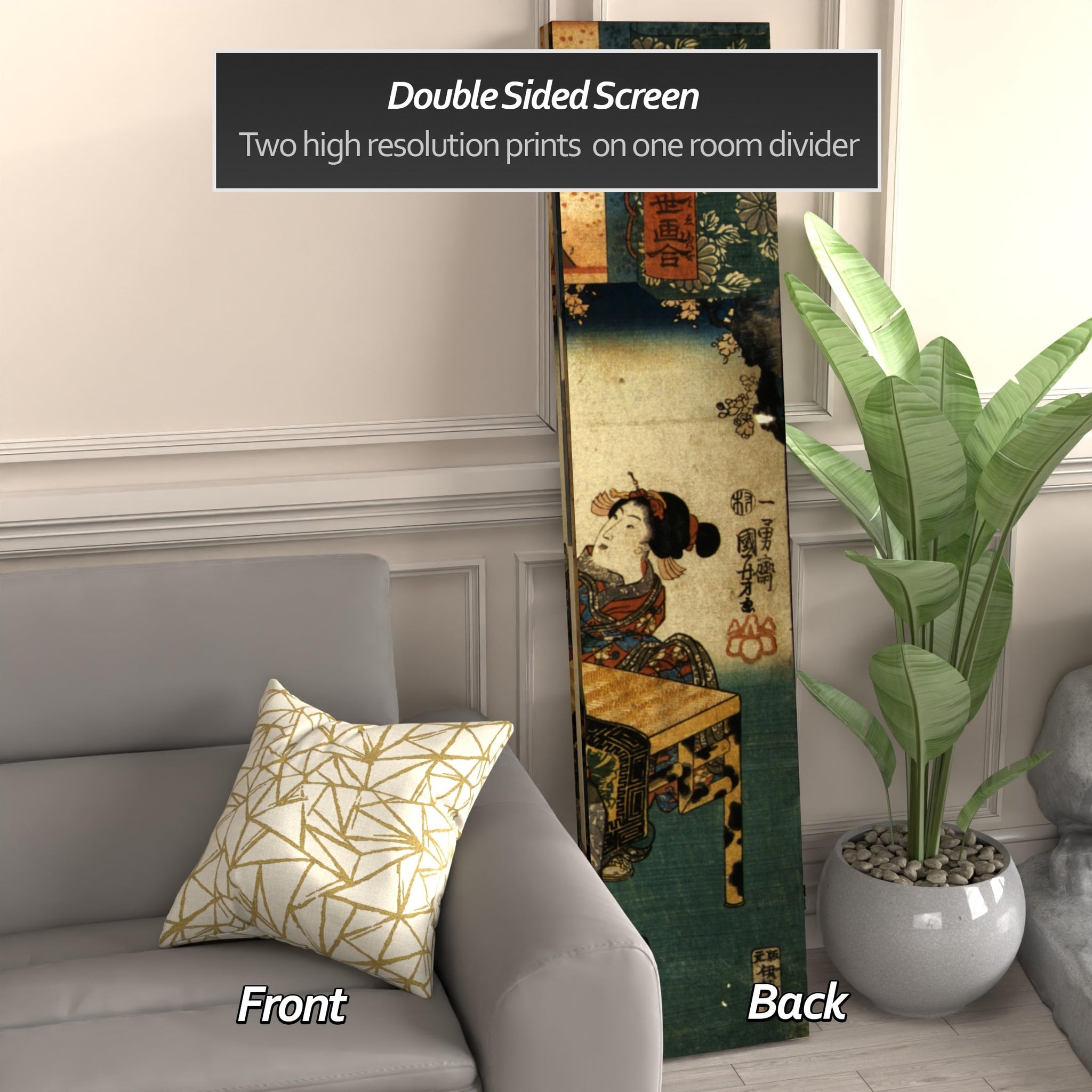 Details: A pair of traditional Japanese images adorn the panels of this exquisite screen. One side depicts a couple viewing the blossoming plum trees of early spring. Above them is a scroll with an excerpt from The Tale of Genji , penned by Murasaki Shikibu in the early eleventh century. On the other side is an image of a noblewoman in an opulent kimono, attending to her puppy. Bring the refined beauty of classical Japanese style into your living room, bedroom, dining room, kitchen or place of business with this breathtaking room divider. This three panel screen has different images on each side, as shown.
