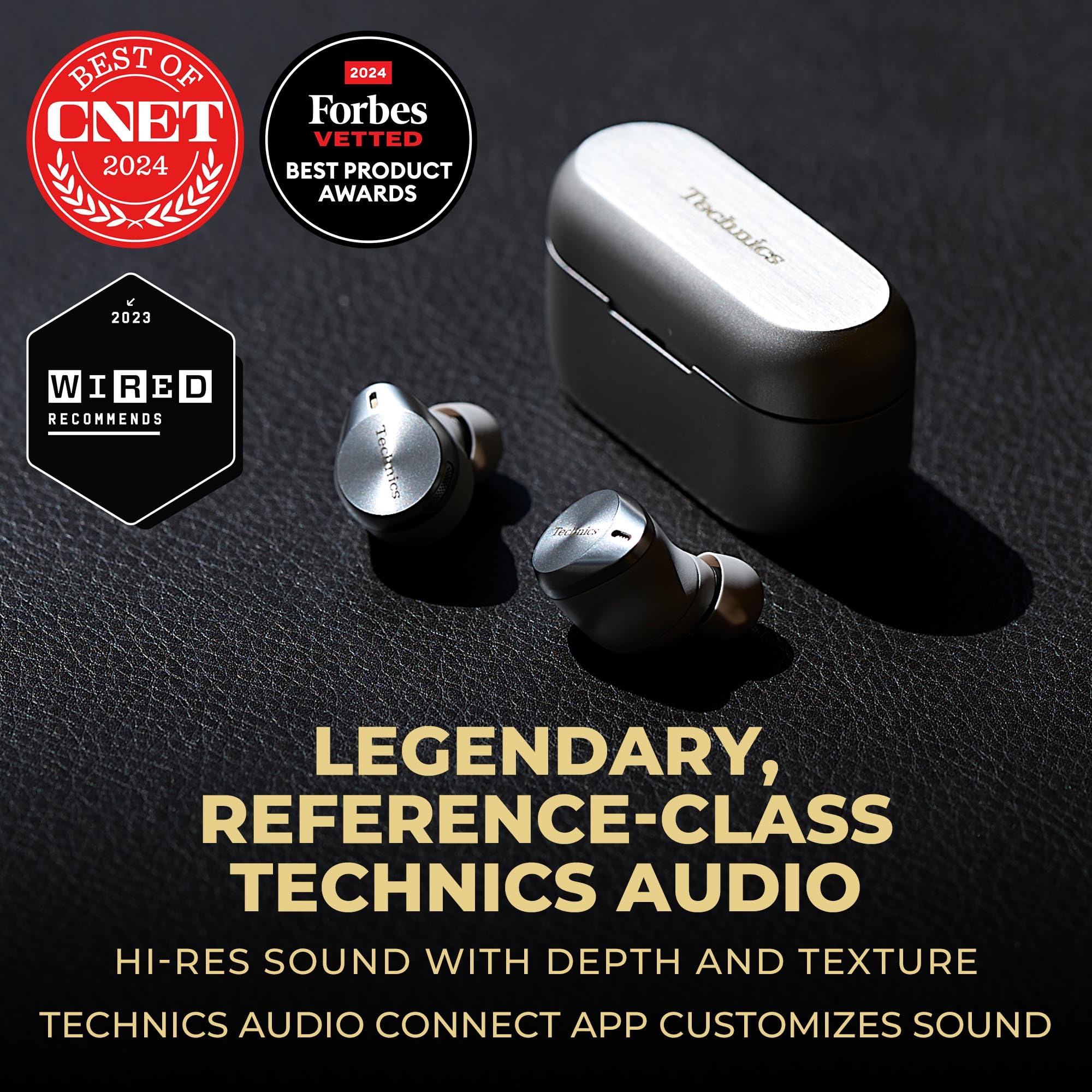 Details: Stay on top of your game with impressively powerful, noise cancelling AZ80 wireless earbuds with reference-quality sound. Discover legendary recorded music as you've never heard it before with Technics' highest-resolution audio, giving you the feel of the arena, an exclusive club, or in-studio magic; hear all the incredible details, from the warm timbre of a singer's voice to the thrill of the beat drop. Like you, these bluetooth earbuds work as hard as they play, with state-of-the-art noise cancellation so you can focus on your critical business. A must-have for high-priority business calls, AZ80 earbuds ensure you voice comes through seamlessly on every call, with enhanced JustMyVoice technology using 8 MEMS microphones and an advanced noise-reducing algorithm to minimize outside interference. Now you can connect to more than two devices at the same time – Technics’ Multipoint technology allows you to connect to three Bluetooth devices simultaneously, keeping you connected to your computer, tablet and phone at once and giving you the ability to multitask with flow, whether you're on a plane or on the golf green. Charge wirelessly (Qi compatible) to keep your workspace and bedside table neat; supports wireless hi-res audio using state-of-the-art Bluetooth with LDAC compatibility. Noise cancellation, EQ, and more are customizable through the Technics audio app so you can always have sound just as you want it.
