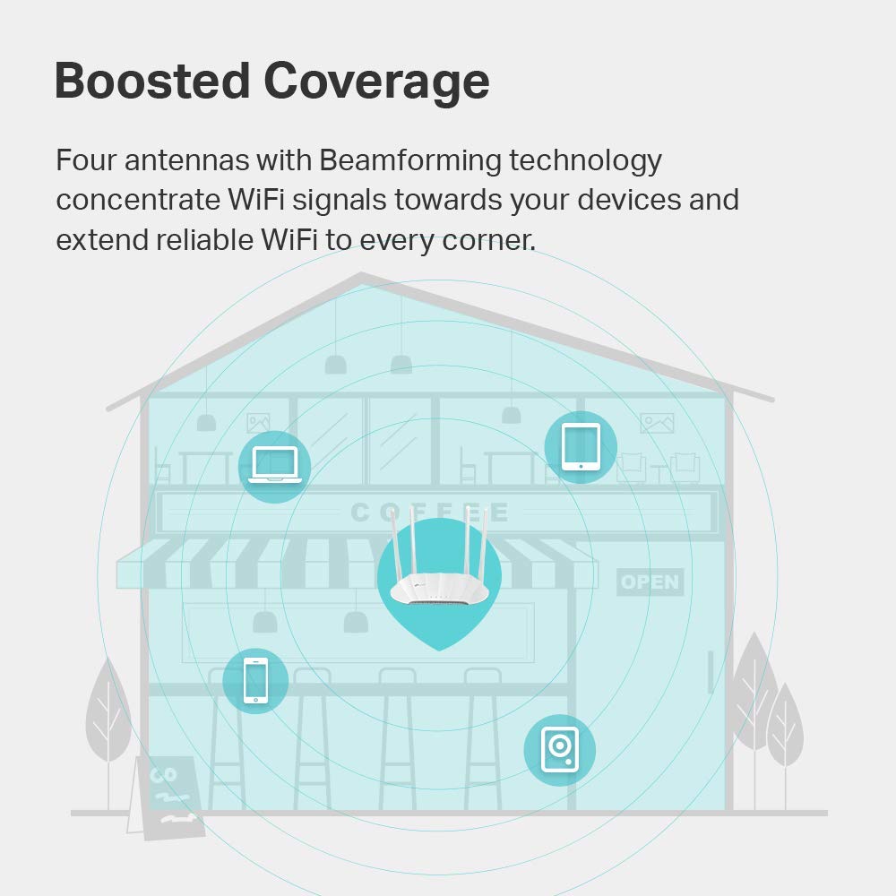 - 【Boosted Wi-Fi Coverage】Four external antennas equipped with Beamforming technology concentrate Wi-Fi signals towards your devices to extend reliable Wi-Fi to every corner of your home or office—even over long distances.