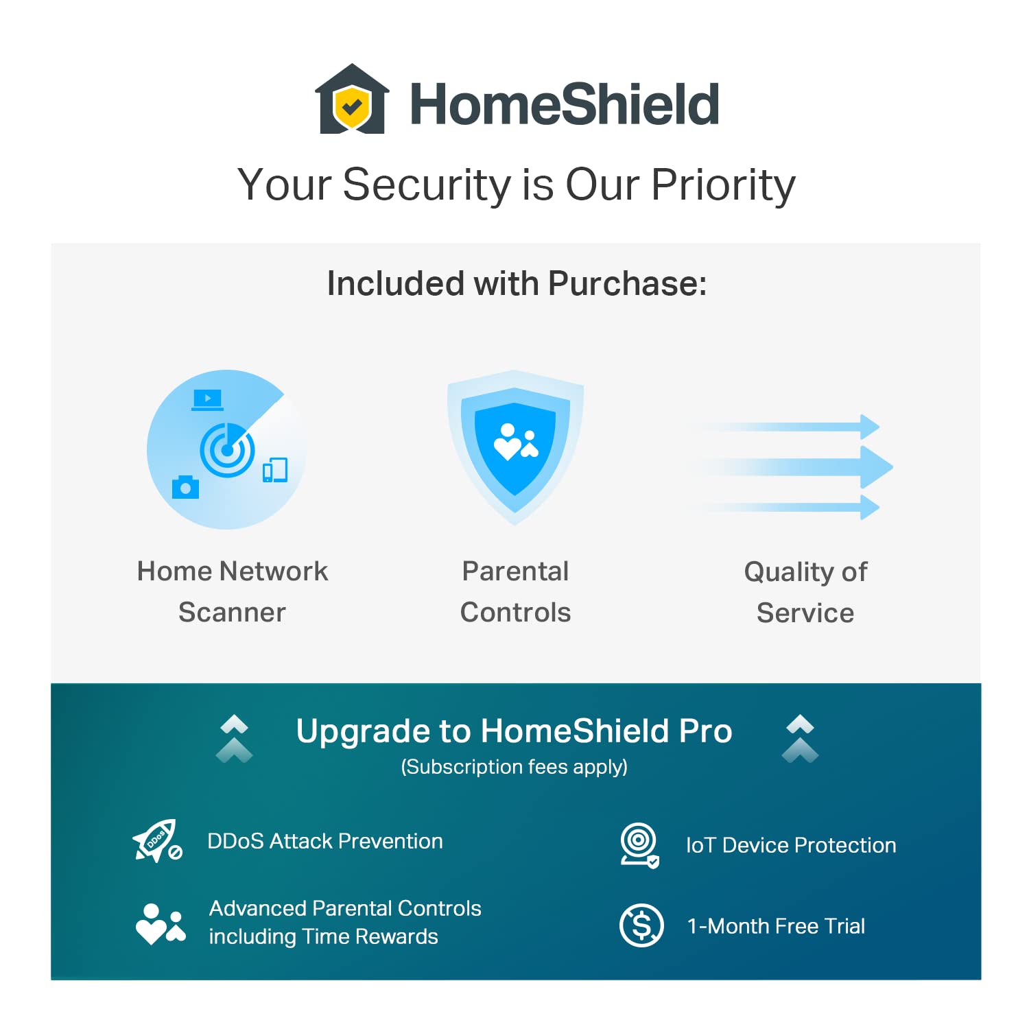 - TP-Link HomeShield - TP-Link's premium security service keeps your home network safe with cutting-edge network and IoT protection. Free features: 1. Basic Network Security including Security Scan and IoT Device Identification 2. Basic Parental Controls 3. Quality of Service 4. Basic Weekly/Monthly Reports. Visit TP-Link website for more information.
