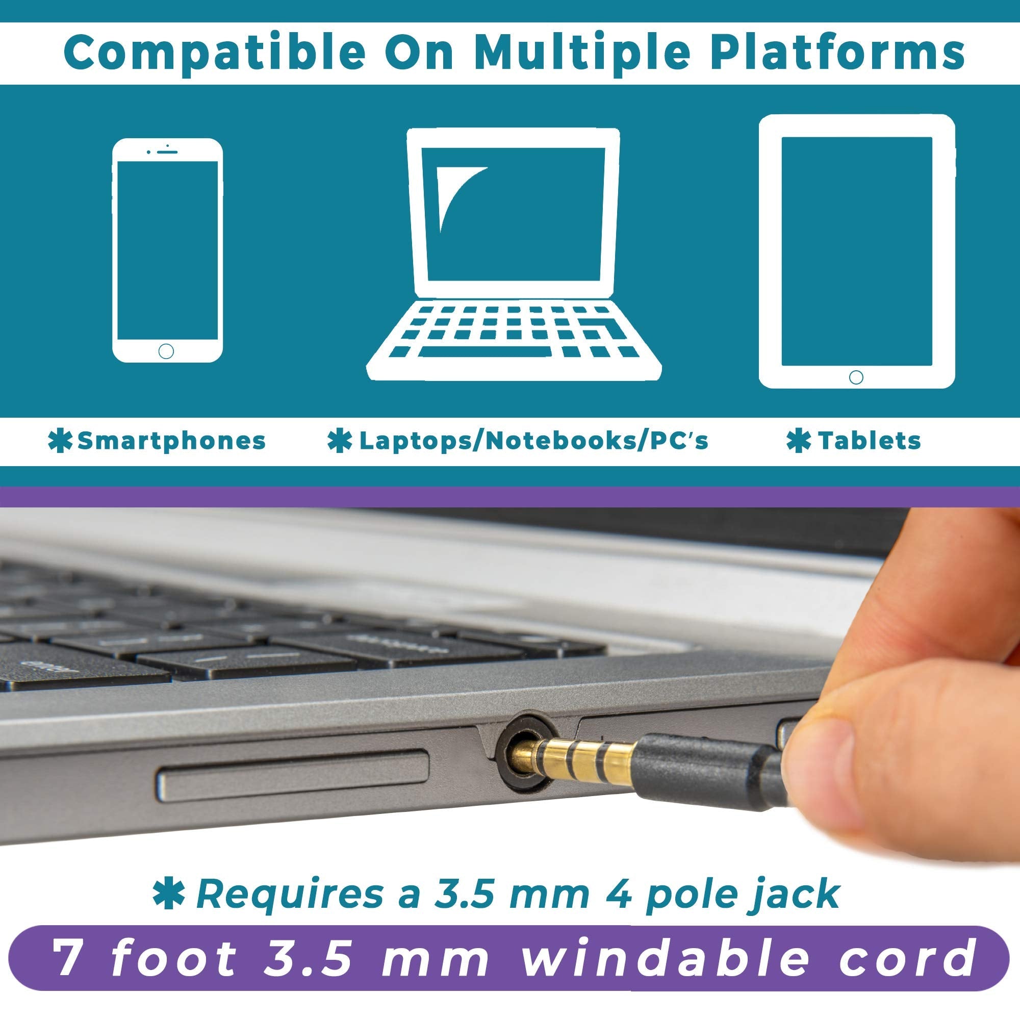 - Compatible with phones, laptops, and desktops equipped with a single 3.5 mm TRRS 4 pole microphone port.