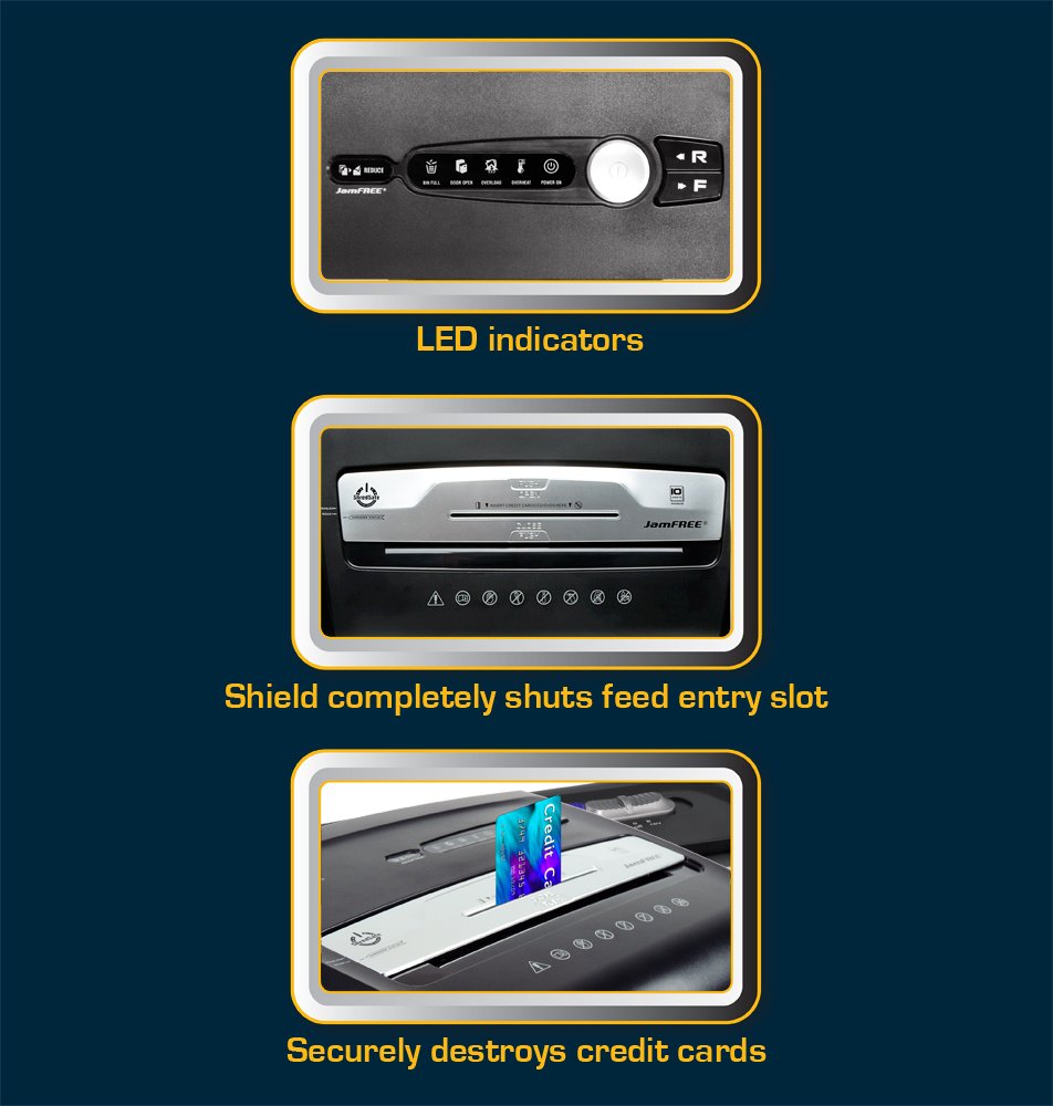 Details: 10 sheet micro shred paper shredder with 5 gallon pullout basket. Advanced Jam Free Technology eliminates paper jams The jam free sensor detects over capacity and shredding will not start to prevent paper jams The shred size of 5/32" x 15/32" has a continues shred of 12 minutes on and 45 off. The small particles reduce the frequency of having to empty the basket less often. The shredder also features Shred Safe, a safety feature which turns the shredder off upon forced entry by a foreign object. Also capable of shredding CD's, Dad's(one at a time) individual credit cards ,staples and paper clips. LED indicators Standby(power)/ Overheat/Overload/Door Open/Jam Free.