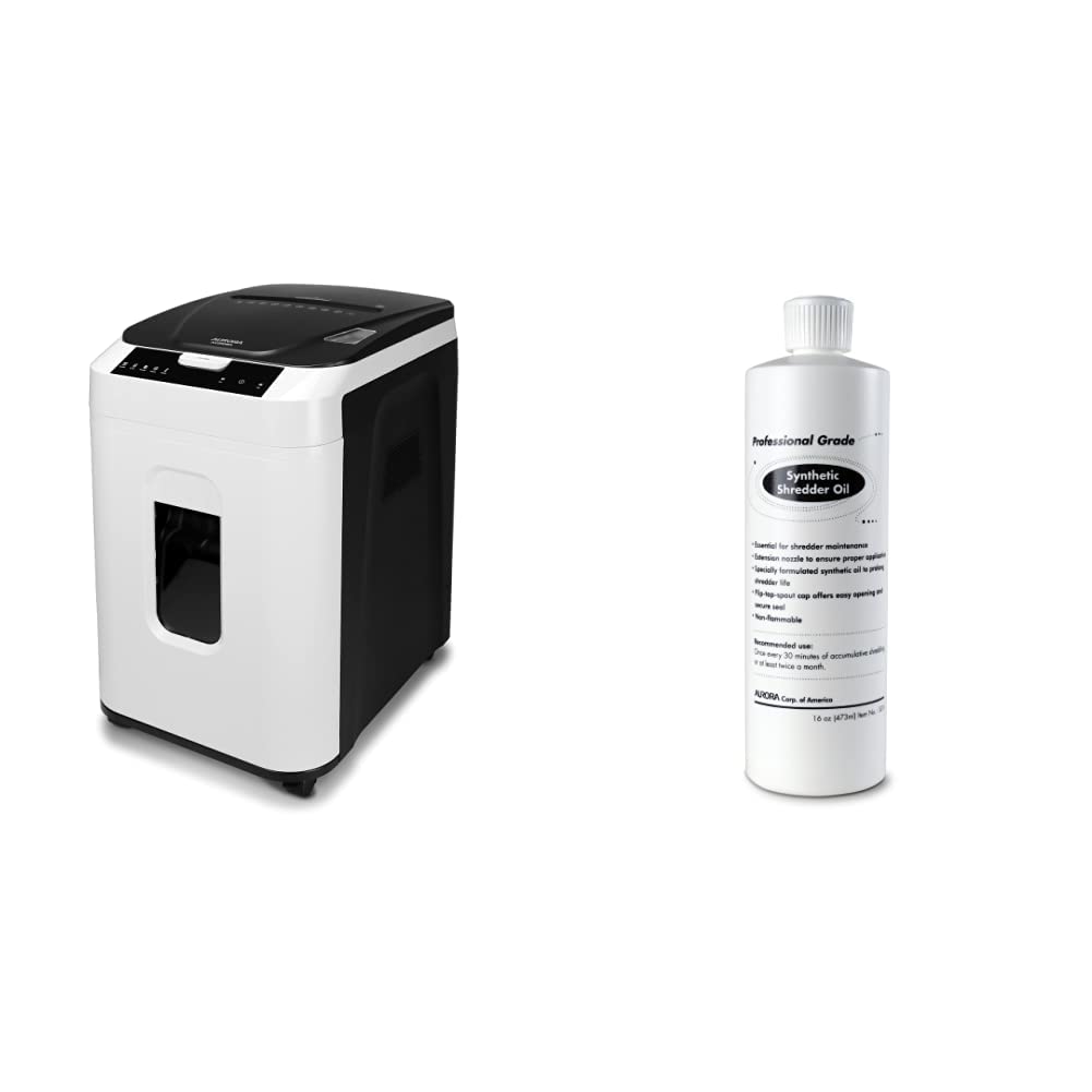 Details: Aurora Commercial Grade 200-Sheet Auto Feed High Security Micro-Cut Paper Shredder/ 60 Minutes/ Security Level P-5 Aurora Commercial Grade 200-Sheet Auto-Feed High Security Micro-Cut Paper Shredder with 8.5-gallon pullout basket is the perfect business and home office device to keep you safe from identity theft. The AU200MA accepts up to 10 sheets of paper at a time and shreds them into small pieces (5/64 by 15/32 inches_ 2 x 12mm), security level P-5. Product Dimensions: 22.83" H x 14.02" W x 18.35" L Item Weight: 38.1 pounds Shipping Weight: 45 pounds Item model number: AU200MA Aurora SL16 Professional Grade Synthetic Shredder Oil, 16 Oz Flip-Top Leak Proof Bottle , Synthetic Shredder Oil 16 oz. Bottle Specially formulated synthetic oil is compatible with any shredder. It lubricates the cutters inside your shredder to ensure high quality shredding performance. 16 oz. Bottle with flip-up spout allows leak-resistant and secure seal. The flip top design of the cap is easily used while oiling and ensures that the cap will never be misplaced. For best result, oil your shredder once every 30 minutes of accumulative shredding or at least twice a month.