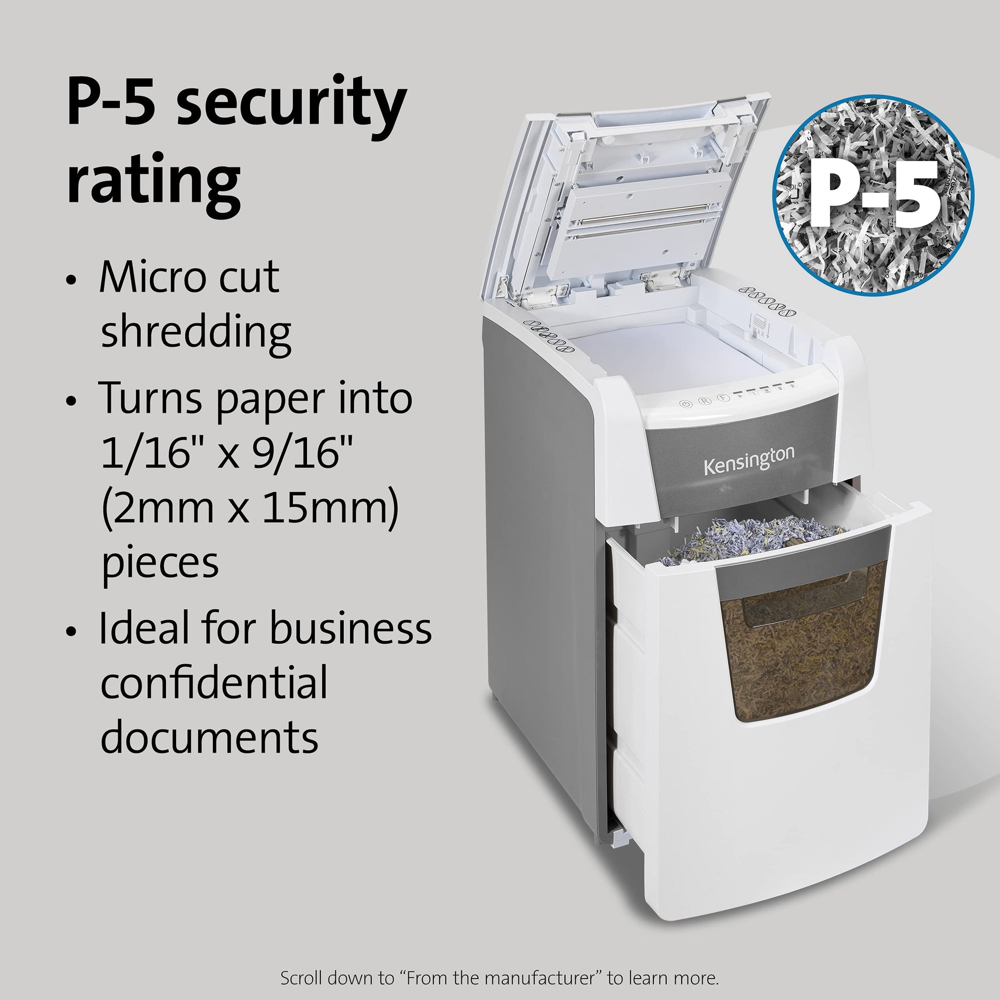 - P-5 security rated micro cut shredding turns paper into 1/16" x 9/16" (2mm x 15mm) pieces. Ideal for business confidential documents