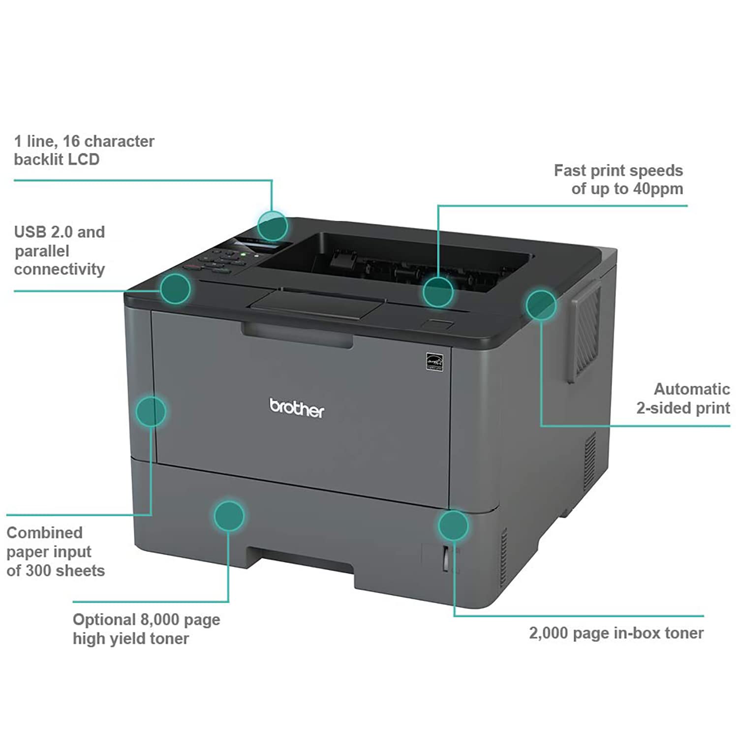 - 〓 Single-Function: Print only. Monochrome Printer: Black and White Printer, Not Co-lor Printer.〓 The Brother HL-L5000D monochrome laser printer is ideal for offices that need a printer with a Automatic two-sided printing compatibility to produce professional brochures, documents and booklets. This feature can help save money and cut your paper usage by up to 50%.