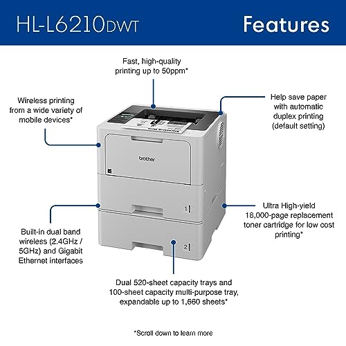 Details: The Brother HL-L6210DWT business monochrome laser printer is a great choice for busy offices and workgroups with higher print volumes that need fast, high-quality output, low-cost printing, large paper capacity, and advanced security features. This high-performance printer helps to increase productivity with a fast print speed of up to 50ppm(1). Spend less time refilling paper trays with dual 520-sheet capacity paper trays, as well as a 100-sheet capacity multipurpose tray for printing on custom media or envelopes(2). Total capacity is expandable up to 1,660 sheets with an optional tray(3). Delivers low-cost printing by using the Brother Genuine TN920UXXL ultra high-yield replacement toner cartridge for 18,000 pages. Includes a Brother Genuine 3,000-page toner cartridge(4). Features built-in Gigabit Ethernet and dual band wireless networking to seamlessly set up and share on your wired or wireless network. Easily print from a wide variety of mobile devices(5). Triple Layer Security features help to limit document and device access and protect against network intrusions. ENERGY STAR® certified and EPEAT® Silver rated. Help save paper with default duplex printing. Eco Mode helps to reduce power consumption, while Toner Save Mode helps to reduce toner use. One-year limited warranty with free online, live chat, or phone support for the life of your product. 1 Print speed based on one-sided printing. Change from default setting required. 2 Maximum tray capacity based on using 20 lb. paper. 3 Requires additional purchase. 4 Approximate toner cartridge yield in accordance with ISO/IEC 19752 (letter/A4). 5 May require free download. Compatibility may vary by device and operating system. Requires connection to a wireless network. 6 The recommended range of monthly printed pages to achieve the best possible performance and printer life. Printers are intended to handle occasional usage beyond this range with little or no effect. Consistently printing above the recommended print volume, however, may adversely affect the print quality or life of the machine. It is always best to choose a printer with an appropriate recommended print volume to allow for any anticipated increase in printing needs. 7 Approximately drum unit yield 45,000 pages based on 1 page per job and 75,000 pages based on 3 pages per job [letter/A4 simplex pages]. The number of pages may be affected due to a variety of factors including but not limited to media type and media size. Images are for illustrative purposes only. Specifications subject to change.