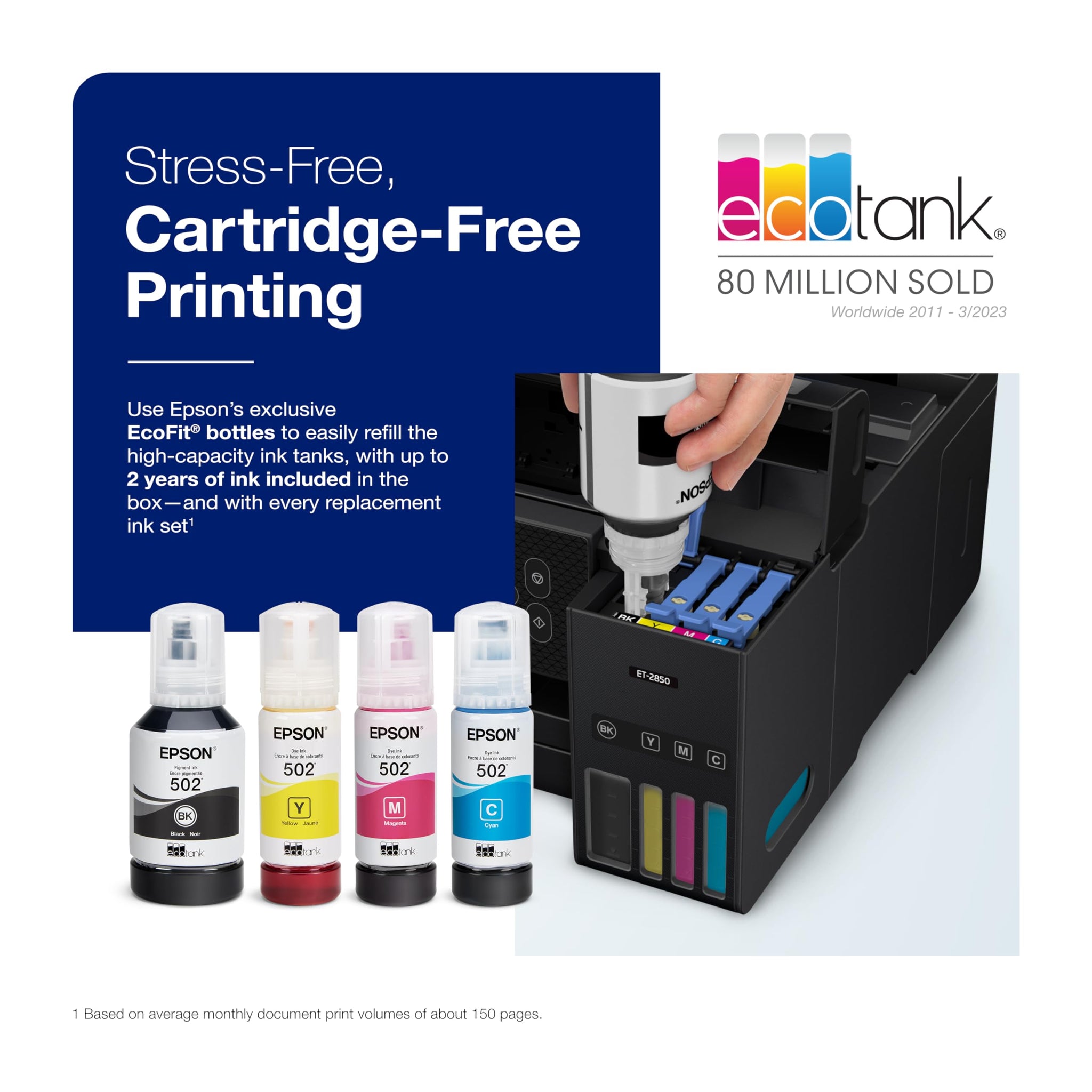 - High-Capacity Ink Tanks ― Epson’s exclusive EcoFit ink bottles make filling easy and worry-free