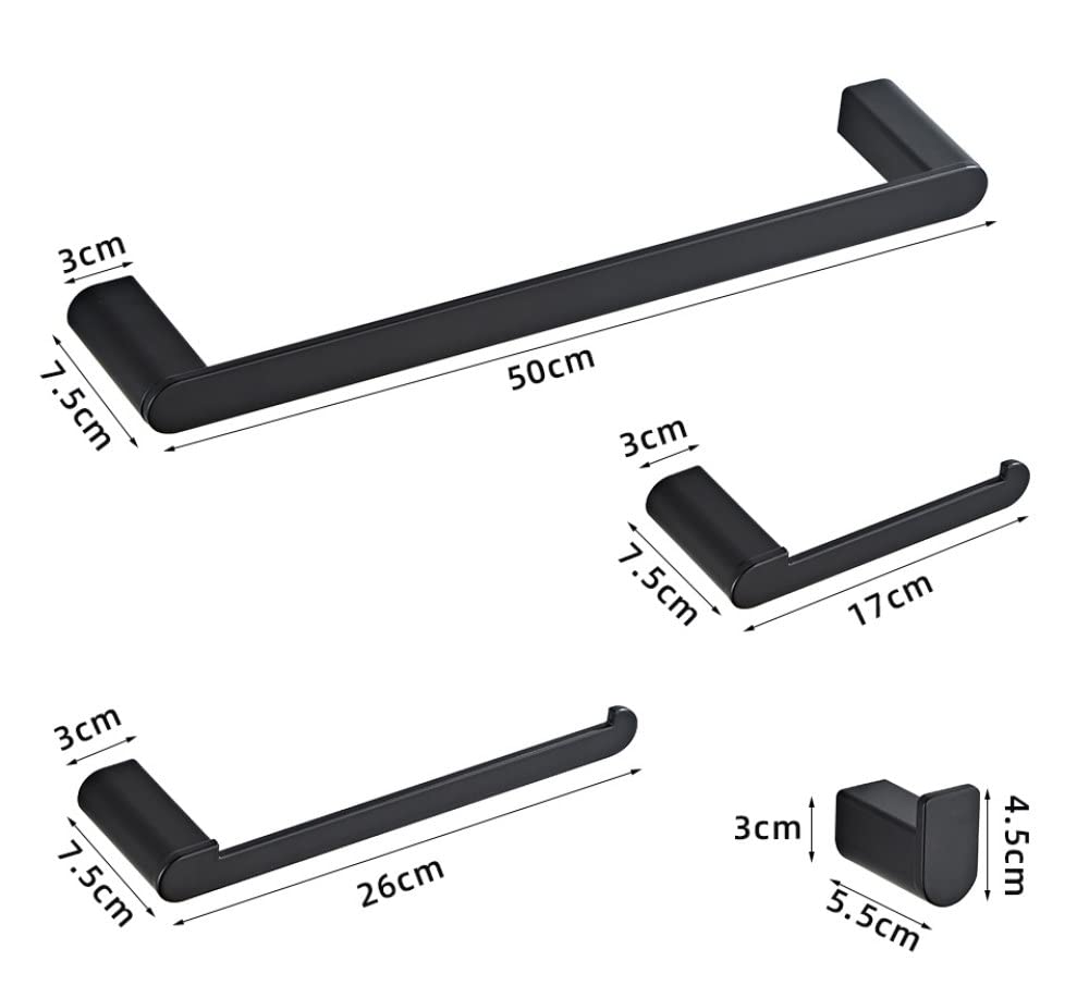 Elevate the look of your bathroom with our Black Bathroom Accessories Set. This 4 piece set includes a wall mounted towel bar, robe hooks, and toilet paper roll holder, all made with stainless steel hardware for durability and a sleek finish. Make a statement in your bathroom with this modern and functional set.