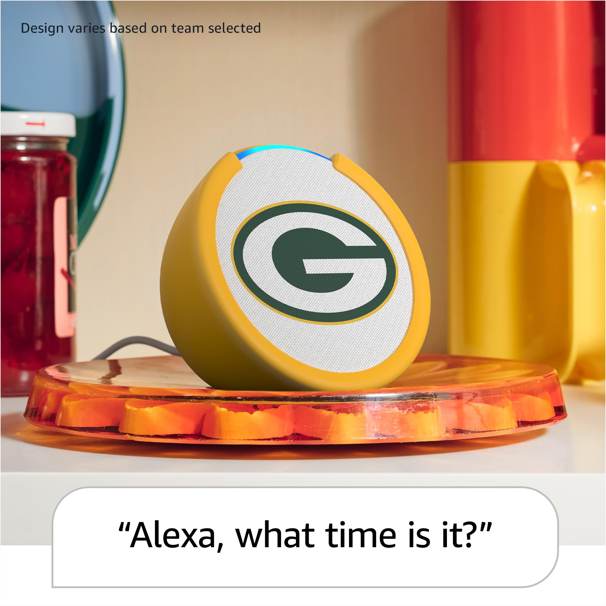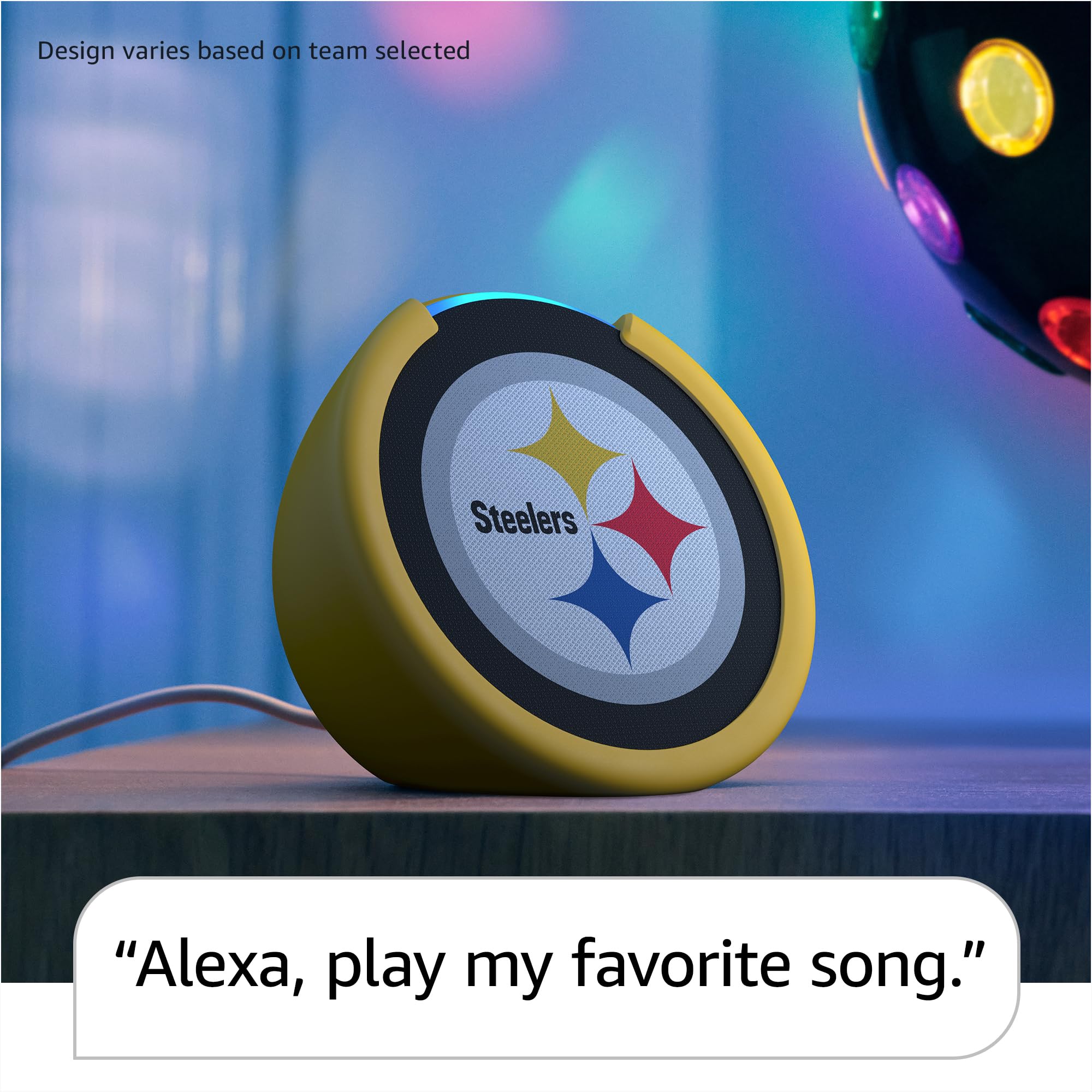 - Officially Licensed NFL Limited Edition Echo Pop – This compact smart speaker with Alexa features full sound that's great for bedrooms and small spaces. Small enough to blend in and mighty enough to stand out.